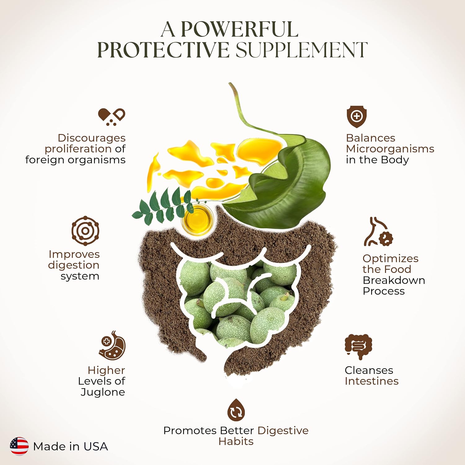 - ESSENTIAL NUTRIENT We harvest the nuts when they are still green because then they contain higher levels of JUGLONE, an essential Nutrient for maintaining Optimal Intestinal Health. The walnuts are kept frozen and then freezedried, with the pits removed, throughout the year to give you as fresh and potent of a product as humanly possible *
