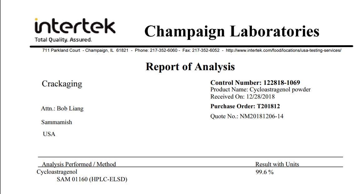 - Uses Cycloastragenol with purity over 98%. The latest test conducted by an independent 3rd-party lab in US shows the purity of our Cycloastragenol is 99.7%