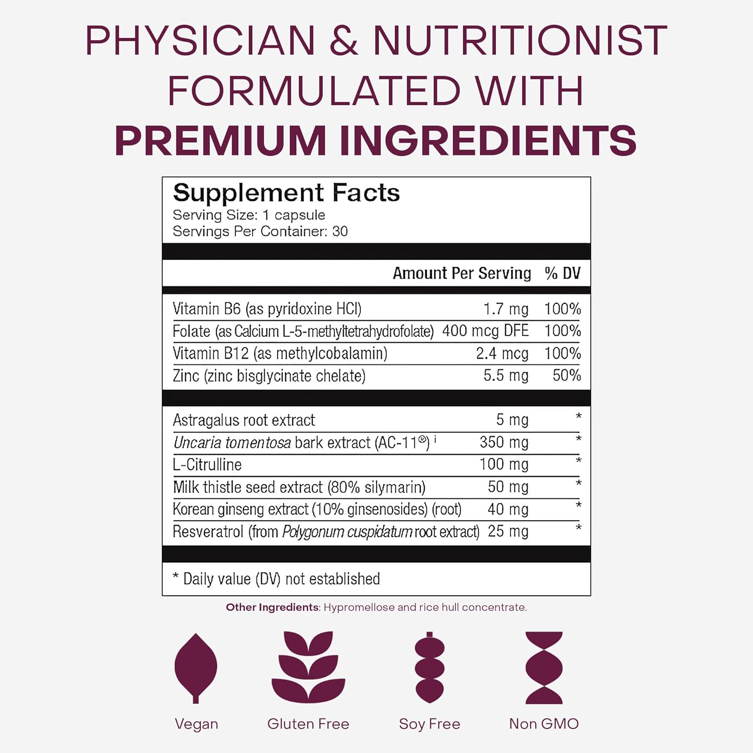 - POWERED BY HERBAL EXTRACTS, COENZYMATED VITAMINS & ANTI-OXIDANTS: Clinically proven rainforest extract, AC-11, works with Zinc to repair cellular DNA. Essential coenzyme vitamins 5-MTHF (the active form of folate) and Methylcobalamin (the active form of B12) reduce homocysteine. High potency herbal extracts boost telomerase enzyme production, and a resveratrol / L-citrulline combo enhances nitric oxide.