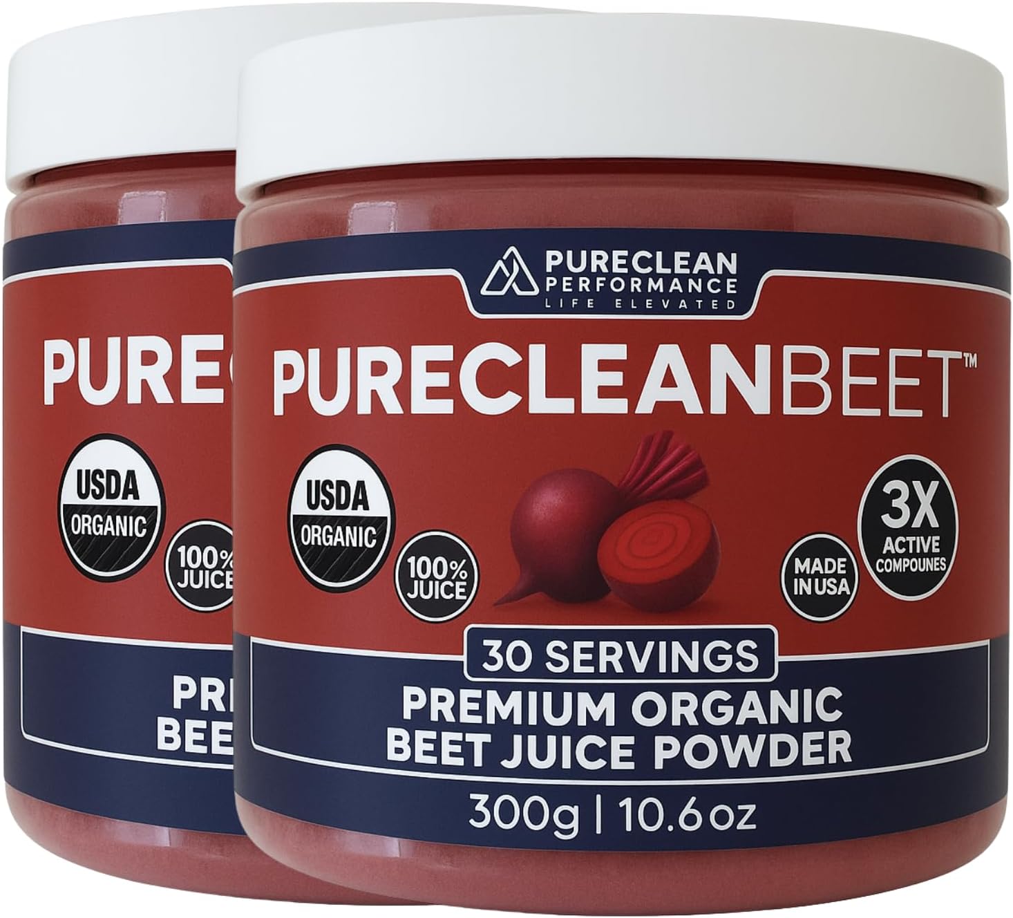 PureClean Organic Beet Juice Powder - Nitric Oxide Supplement - 100% USA Grown Beets - Organic Beet Root Powder 30 Servings, 300g (2 Jars 60 Servings)