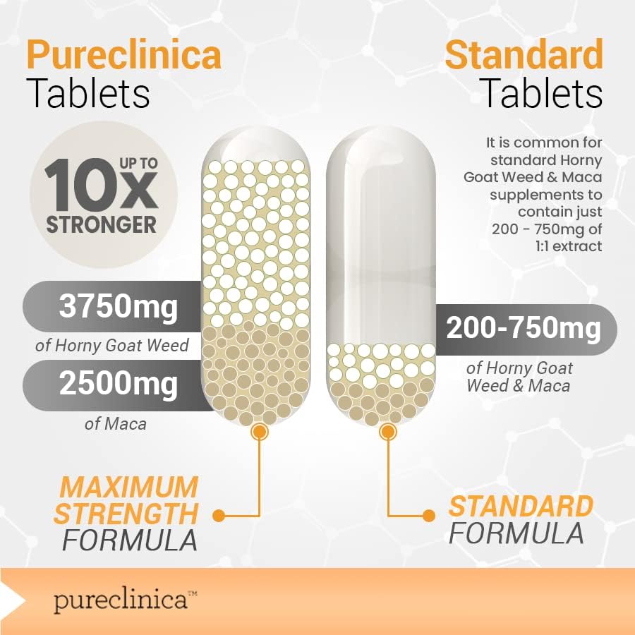 - 2 to 10 TIMES MORE HORNY GOAT WEED - each tablet provides 750mg of 5:1 Horny Goat Weed extract, equivalent to 3750mg of plant, compared to the more common 100mg, 250mg or 500mg tablets. Many of our competitors advertise 250mg, 500mg, or even 1000mg Horny Goat Weed extract, but fail to mention until the small print that this is not per tablet, but rather per 2, 3 or even 6 tablet serving per day. With ours, you need only take one 3750mg tablet