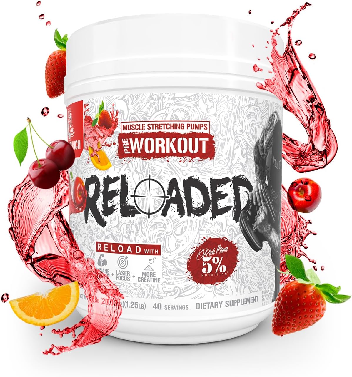 5% Nutrition Rich Piana Reloaded High Stim Pre-Workout | Ultra Energy, Focus, Pumps, Power & Endurance | Citrulline, GlycerSize, Nitrosigine, Creatine, Choline, Huperzine A (Fruit Punch)