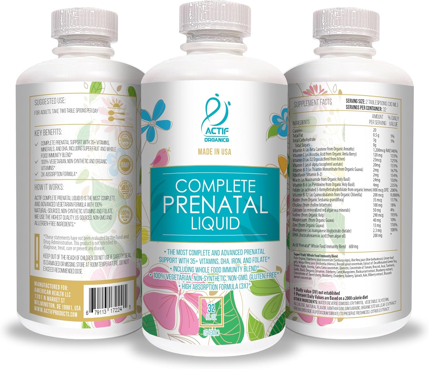 ACTIF Organic Complete Prenatal Liquid with 35+ Vitamins and Organic Herbs, with DHA and Choline, Non-GMO, Made in USA, 32oz