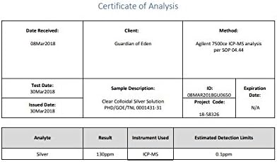 - 130 ppm (minimum) Pure Colloidal Silver. Top Rated Lab tested - see pictures. Question why if a seller can not prove contents.