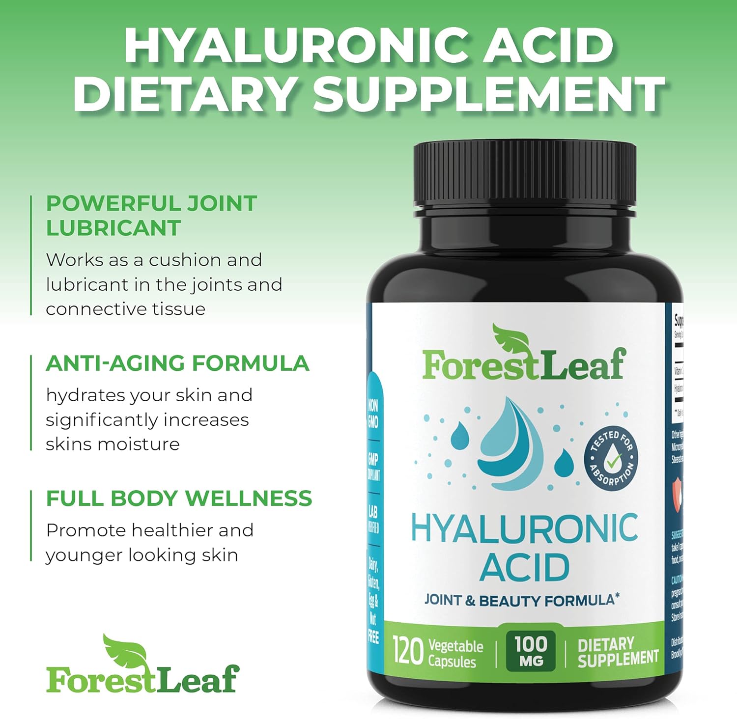 - Trusted ForestLeaf Brand – Made with care and backed by science – ForestLeaf hyaluronic acid nutritional supplements are crafted for results, with a reputation for clean, reliable wellness solutions. Whether you’re seeking hyaluronic acid pills for women, men, skin, or joints, join thousands of happy customers who count on ForestLeaf for their daily wellness routine*