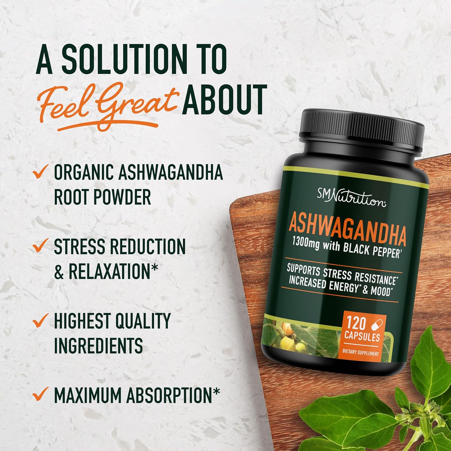 Ashwagandha Supplement 1300mg for Stress Resistance & Energy Boost | High Absorption Adaptogen from Root Powder with Black Pepper | Stress-Related Fatigue Support | Non-GMO | 120ct, 2-Month Supply