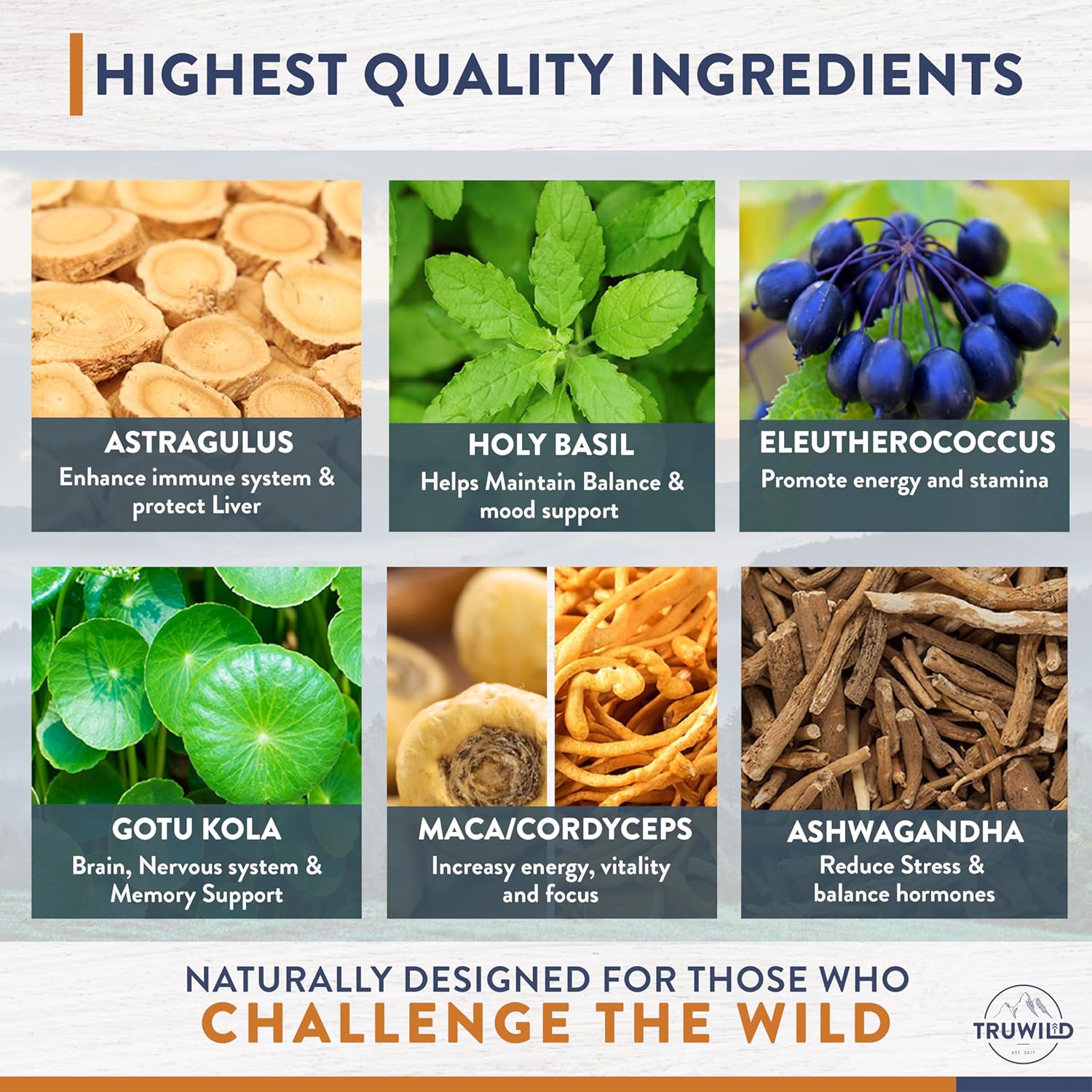 TruWild Adaptogen Blend with Cordyceps Maca Ashwagandha - Full Spectrum Mushroom Blend for Daily Support and Function, All Natural Formula with 7 Key Ingredients, 60 Capsules