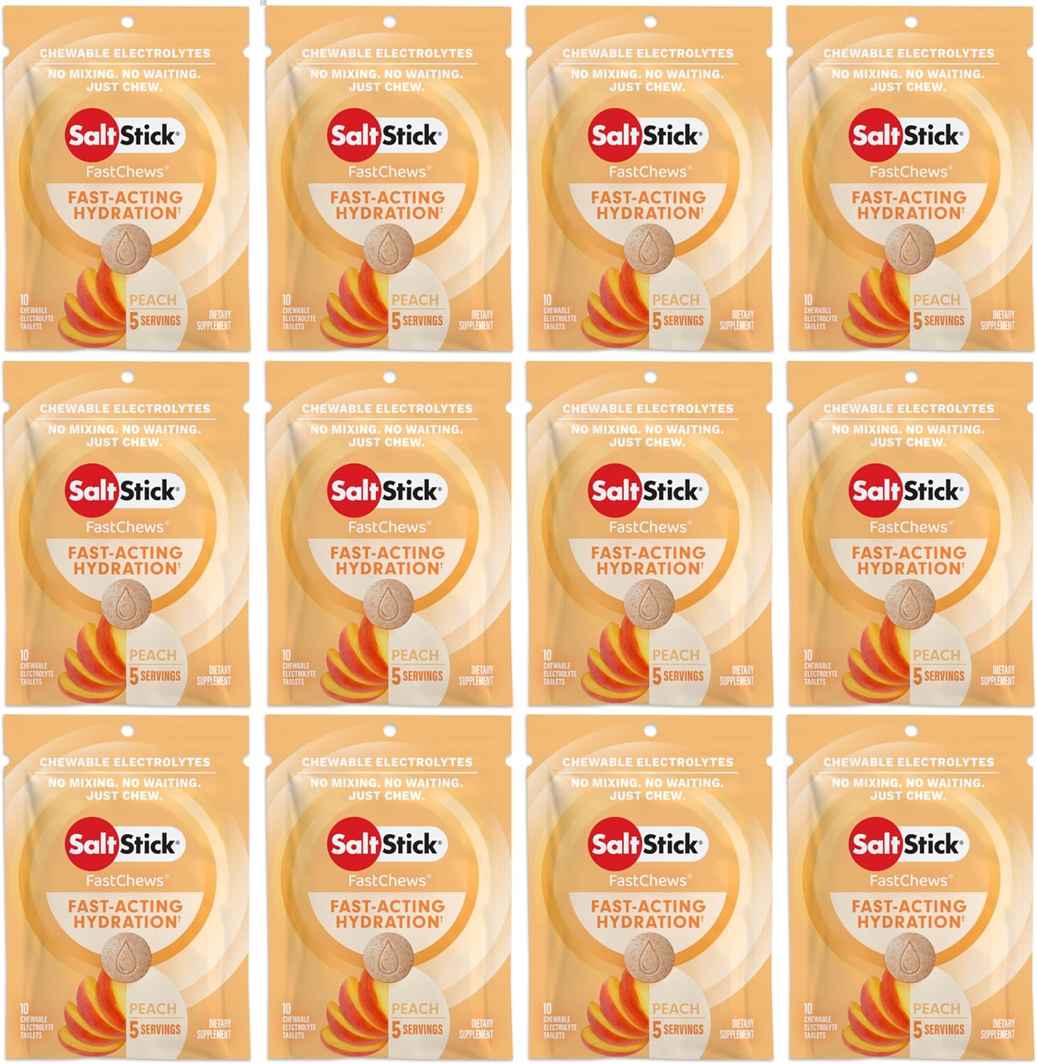 SaltStick Electrolyte FastChews - 120 Peach Chewable Electrolyte Tablets - Electrolyte Chews, Salt Tablets - 12 Packets, 10 Tablets Each