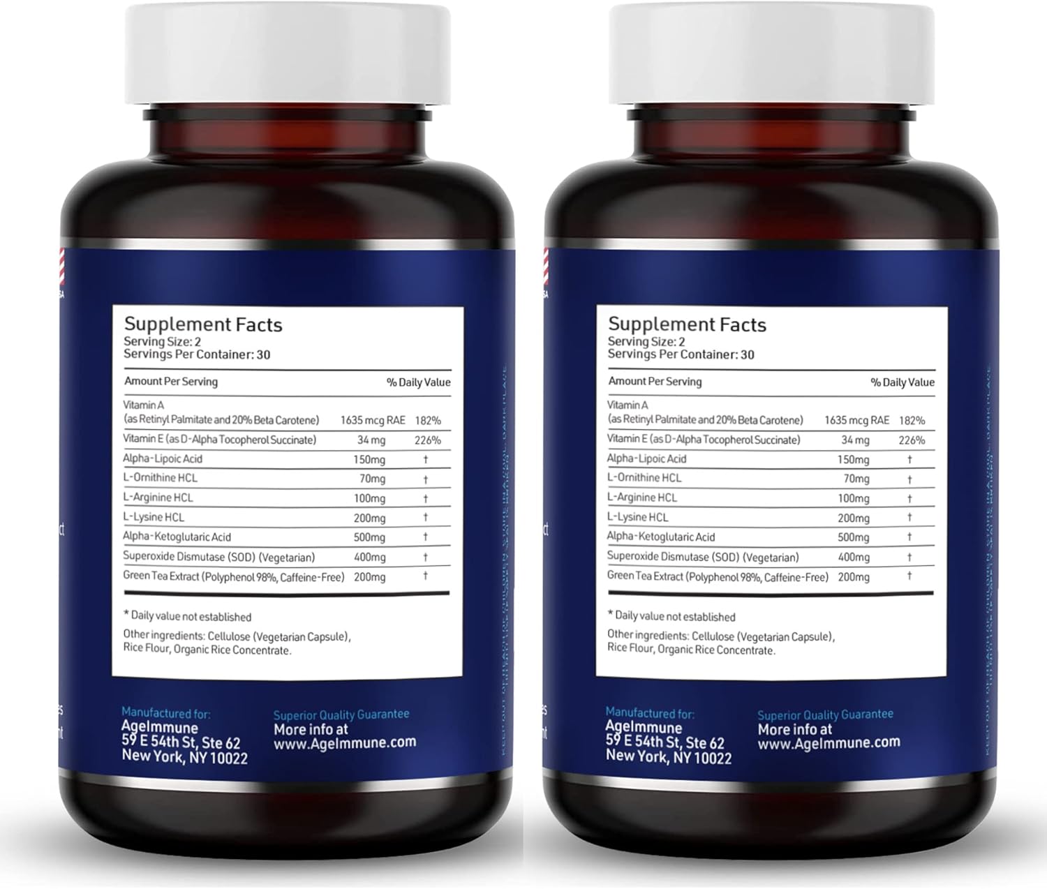 SOD Antioxidants Complex Healthy Aging Supplement, 400mg of Superoxide Dismutase, Alpha Lipoic Acid, Green Tea Extract, L-Arginine, Lysine, AKG, Vitamin A, Vitamin E - 60 Capsules -2 Bottles