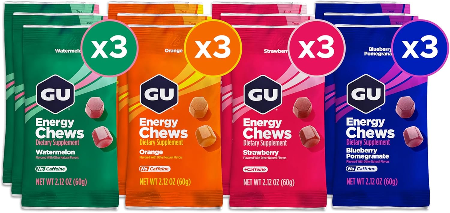 GU Energy Chews, Variety Pack Energy Gummies with Electrolytes, Vegan, Gluten-Free, Kosher, Caffeine/Caffeine-Free, and Dairy-Free On-The-Go Energy for Any Workout, 12 Bags (24 Servings Total)