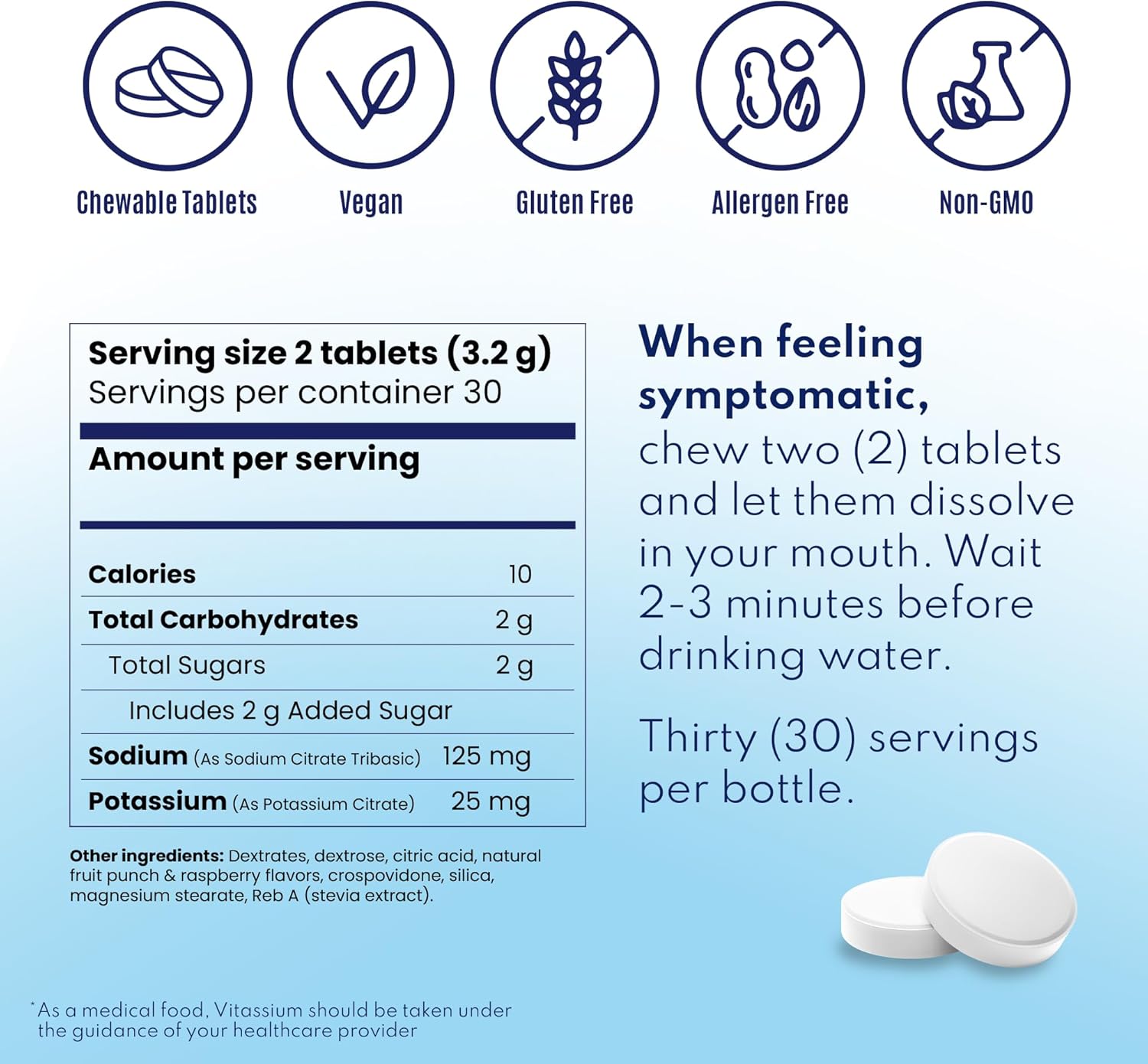 - CHEWABLE ELECTROLYTE TABLETS: With 125mg of sodium and 25mg of potassium per serving (from sodium citrate & potassium citrate), Vitassium FastChews are flavored sodium tablets scientifically formulated for the specific dietary management of high salt diets that can benefit from electrolyte supplements.