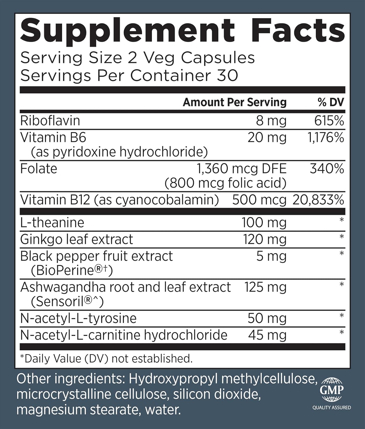 - Your A-Team For BrainPower: Along with ALC, our research found impressive results in: Ginkgo Leaf Extract for blood circulation to the brain; L-Theanine for alpha brain-wave activity; Ashwagandha Extracts (Sensoril) for calm thoughts & reduced inflammatory reactions; Black Pepper Fruit Extract (BioPerine) for neurological support; Vitamins B6, B12 & Folate for improved memory performance; L-Tyrosine for neurotransmitter production; and, Riboflavin for smooth overall cognitive functions.