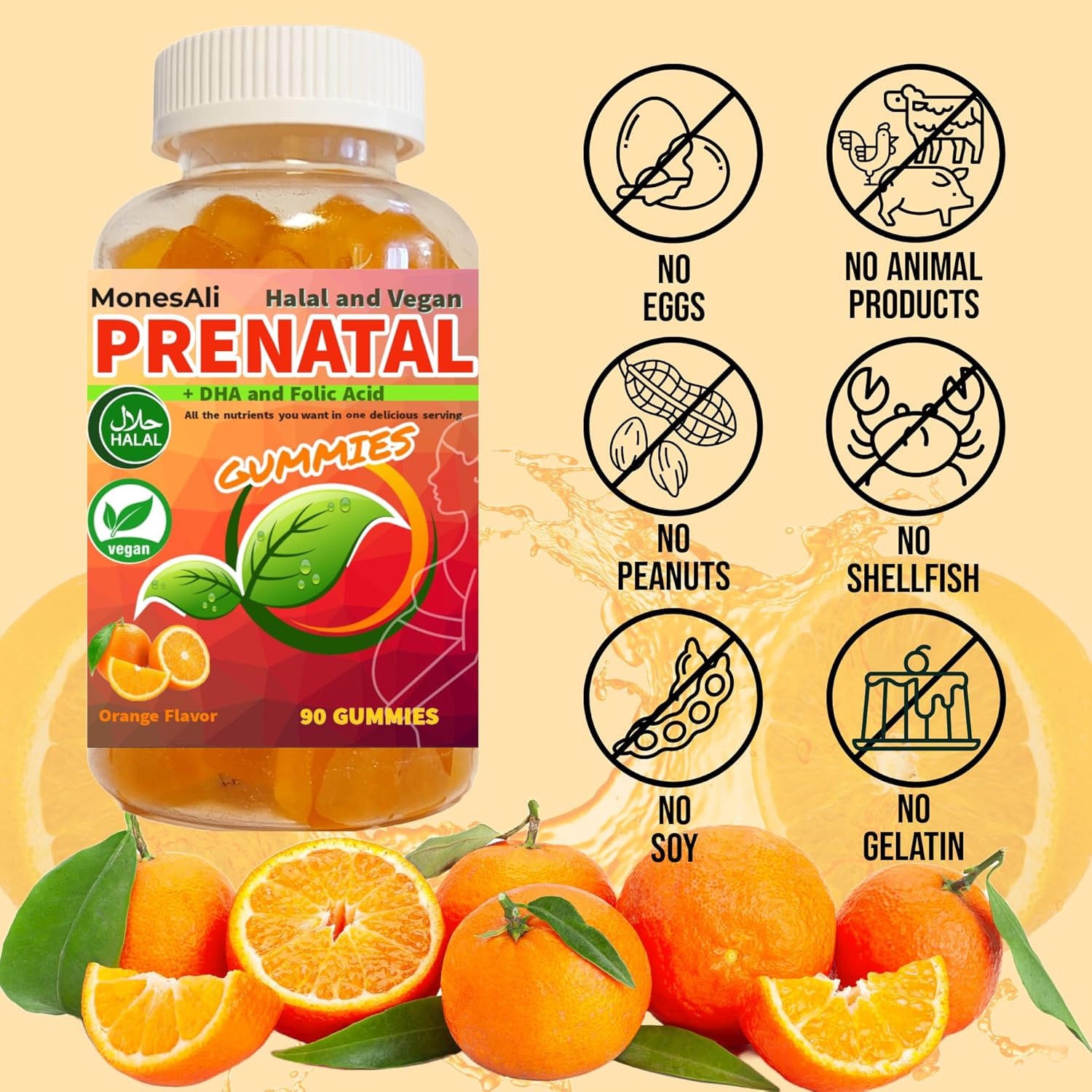 - Our prenatal vitamins for women do not contain GMOs, gluten, soy, gelatin, animal products or shellfish. MonesAli Prenatal Vitamin Supplements are perfect match for those with special diet who likes Vegan, Halal or Kosher. Each bottle contains 90 prenatal gummies - Orange flavor gummies supplements taste and smell as great as they make you feel! Our women multivitamin supplements are deliciously healthy without having to break the bank!