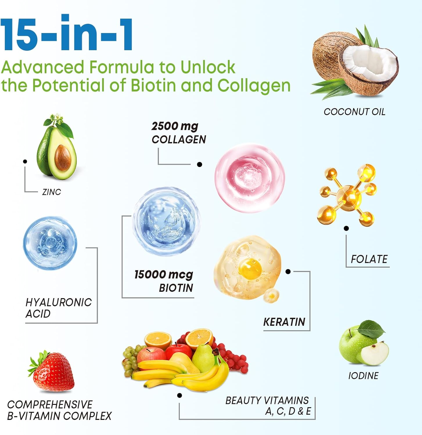 - 15 in 1 Innovative Formula and Effective: These biotin gummies are packed with a high potency of biotin per serving with collagen, keratin, coconut oil, and folate as well as hyaluronic acid, pantothenic acid, zinc, iodine, vitamins A, C, D, E, B6 & B12 to revitalize your look from the inside out and support your overall wellness