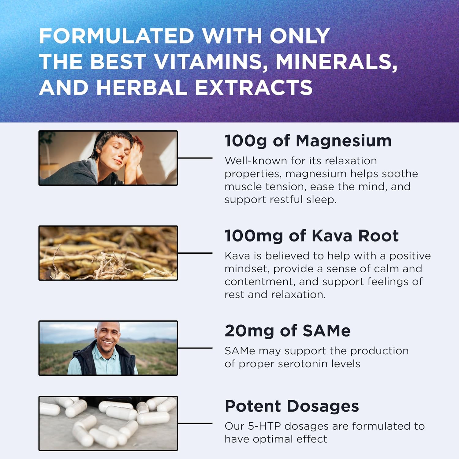 200 MG 5-HTP Elite with Kava Root Extract, Magnesium & SAM-e to Maintain Normal Healthy Sleep & Create a Sense of Wellbeing - 5HTP Supplement with Vitamin B6 - 60 Capsules, 30 Servings