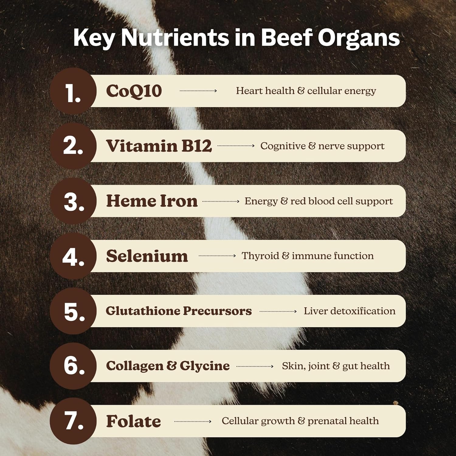 - Grass-fed and grass-finished: Our 100% grass-fed beef organ supplement is sourced from regeneratively-raised cattle and provides nature-identical ratios of beef liver, heart, kidney, spleen, and pancreas for optimal health benefits.