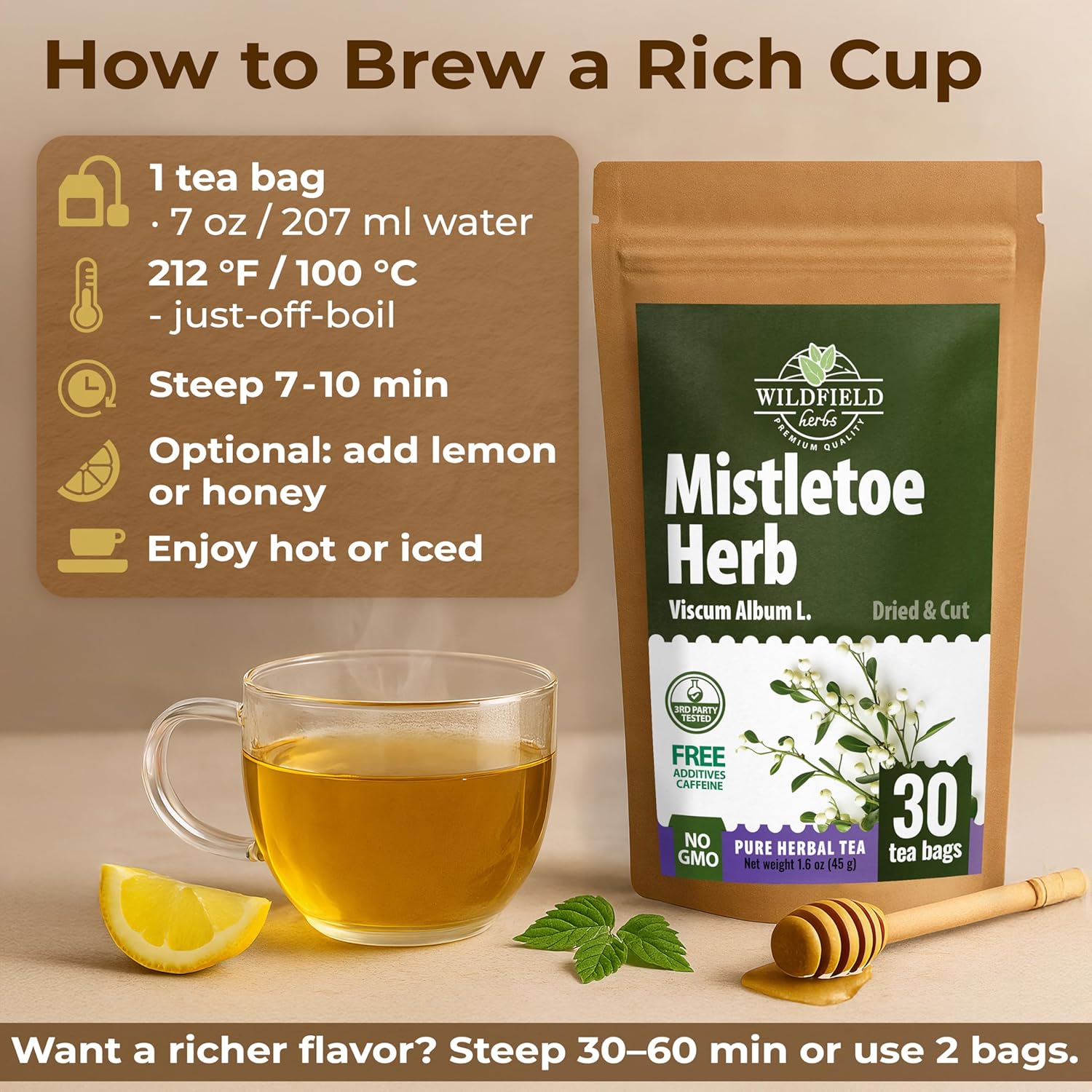 - Active Ingredients : Viscum - 100%. Mistletoe Herb tea loose leaf are steeped in hot water to create a rich tea. This tea is believed to have good properties. Region of origin of mistletoe herb Herbal Tea: Europe.