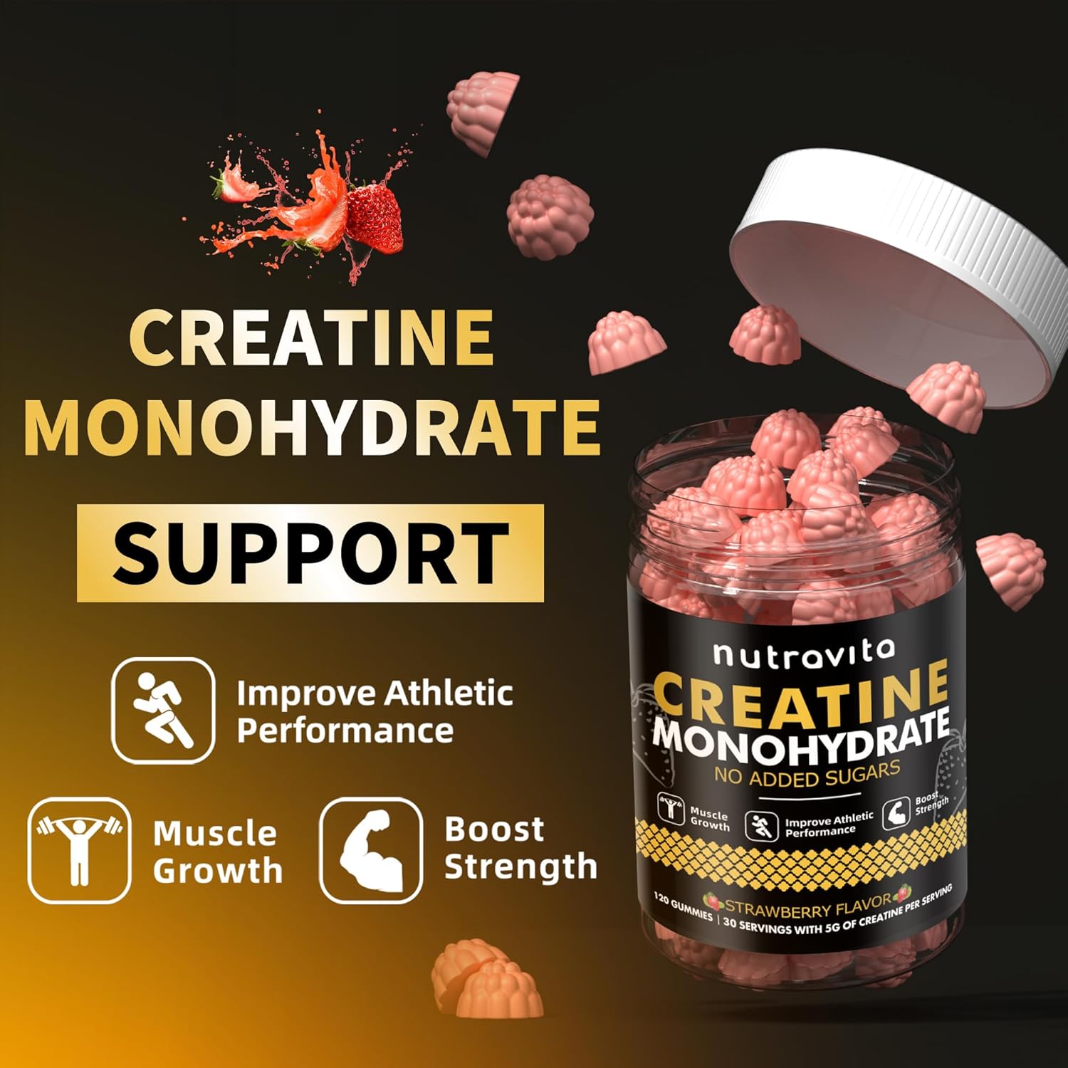 Creatine Monohydrate Gummies for Men & Women-5g of Creatine Monohydrate per Serving - Sugar Free,Vegan, Strawberry Flavor, 120 Count
