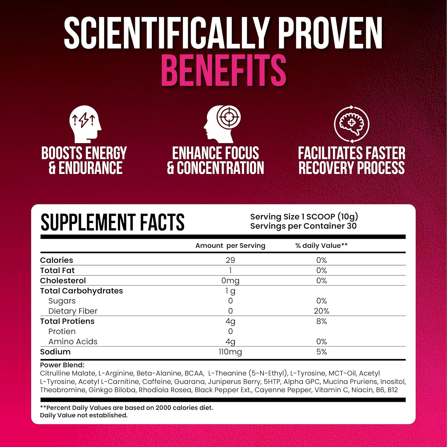- Premium Ingredient Blend: Our pre workout powder for women and men is crafted with a potent blend of ingredients such as Beta-Alanine, Citrulline Malate, L-Theanine, L-Tyrosine, Alpha-GPC, MCT-Oil, 5HTP, Ginkgo Biloba and amino acid powder