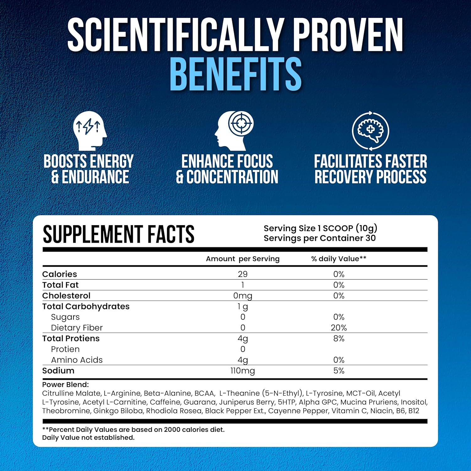 - Premium Ingredient Blend: Our pre workout powder for women and men is crafted with a potent blend of ingredients such as Beta-Alanine, Citrulline Malate, L-Theanine, L-Tyrosine, Alpha-GPC, MCT-Oil, 5HTP, Ginkgo Biloba and amino acid powder