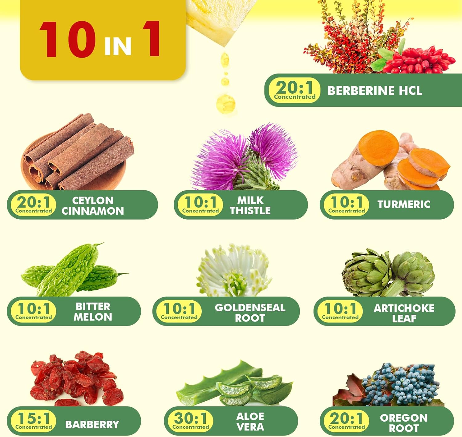 - 【Berberine Supplement with Ceylon Cinnamon】-- Berberine liquid drops supplement made with natural ingredients.We extract key elements from natural herb ingredients.We've combined a unique blend of more naturally sourced herbs extracts Berberine HCI, Aloe vera, Bitter Melon, Ceylon Cinnamon, Milk Thistle, Turmeric, Artichoke Leaf, Chromium, Cactus, Turmeric Curcumin Root, Goldenseal Root, Black Pepper, and Vegetable Cellulose. Berberine and Turmeric ingredients combine forces to enhance your digestion health.