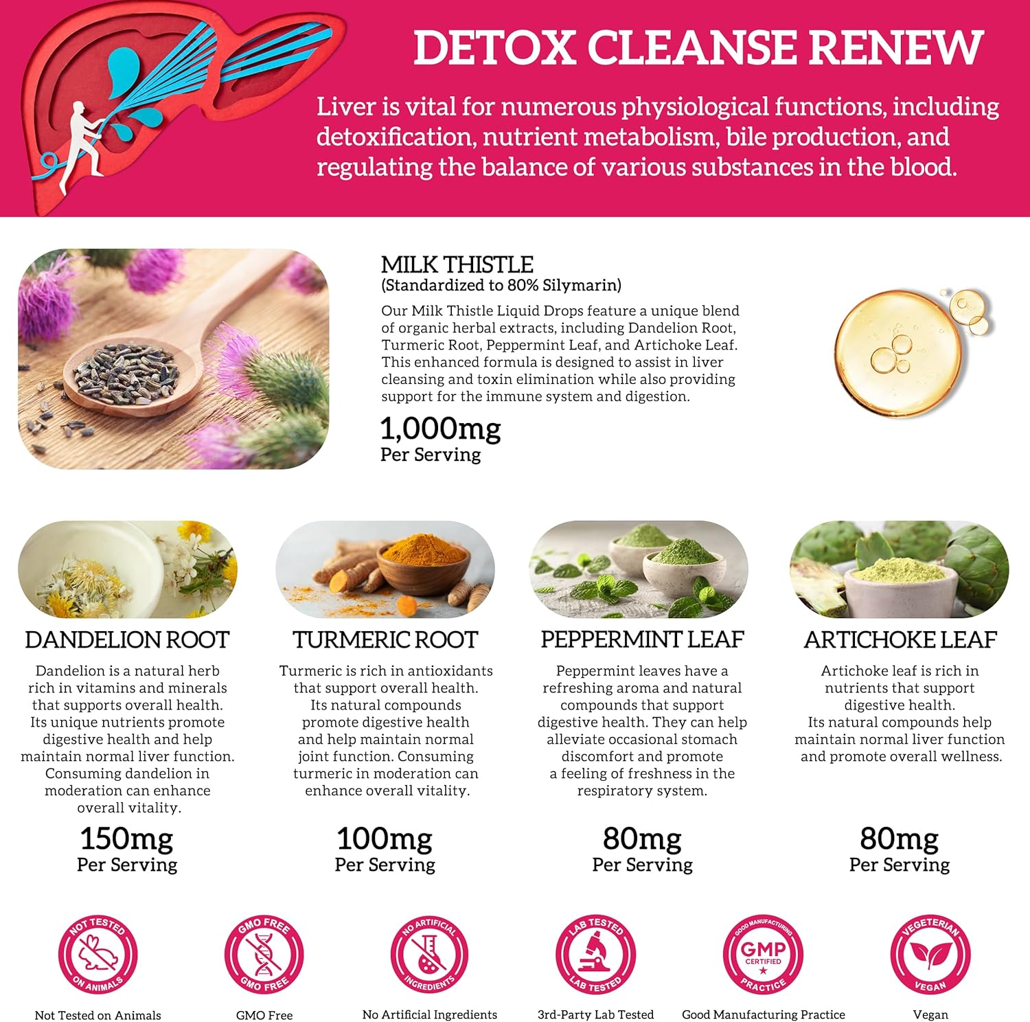 - 【5 in 1 Comprehensive Support】Our Milk Thistle Liquid Drops feature a unique blend of organic herbal extracts, including Dandelion Root, Turmeric Root, Peppermint Leaf, and Artichoke Leaf. This enhanced formula is designed to assist in liver cleansing and toxin elimination while also providing support for the immune system and digestion.