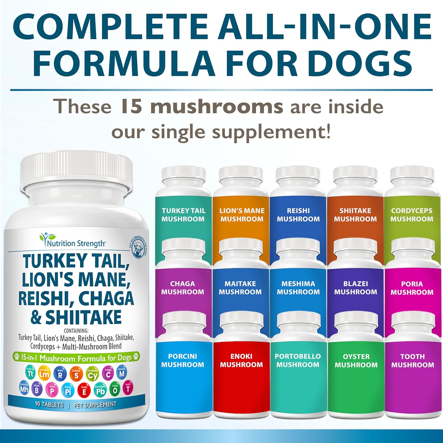 - Powerful 15-in-one immune support supplement for dogs: Nutrition Strength's premium multi-mushroom blend for dogs is packed with a potent mix of lion's mane supplement for dogs, turkey tail supplement for dogs, reishi mushroom powder for dogs, chaga extract for dogs, shiitake dog tablets, maitake powder for dogs and cordyceps dogs extract; clear out all those countless bottles in your pet's supplement cabinet, like meshima mushroom for dogs and poria mushroom extract for dogs and give them just one lion's mane, turkey tail mushroom supplement for dogs