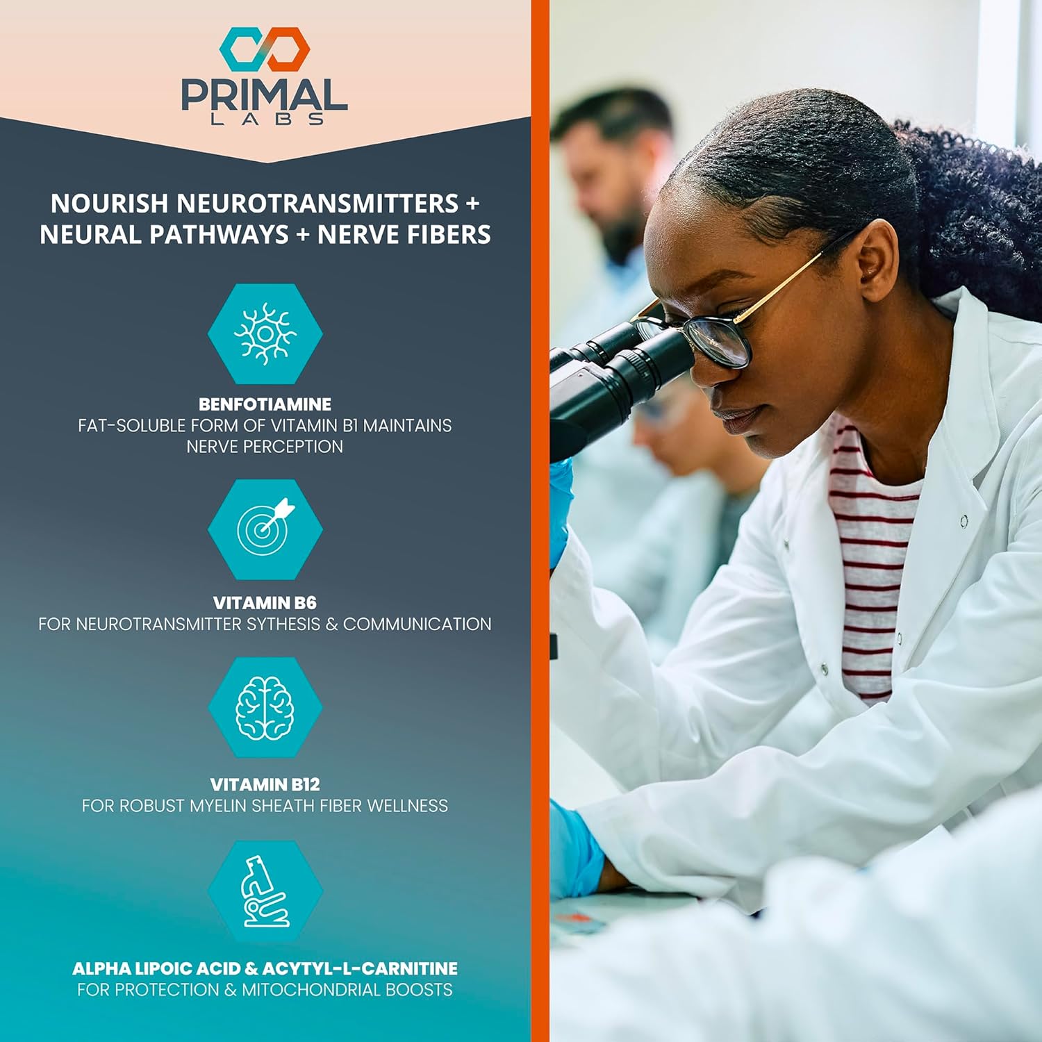Primal Labs Advanced Nerve Support - Nerve Wellness Supplement with Benfotiamine, B6, B12, Alpha Lipoic Acid, Acetyl-L-Carnitine - Nerve Wellness, Feet, Legs, Sensory Function, Comfort - 60 ct.