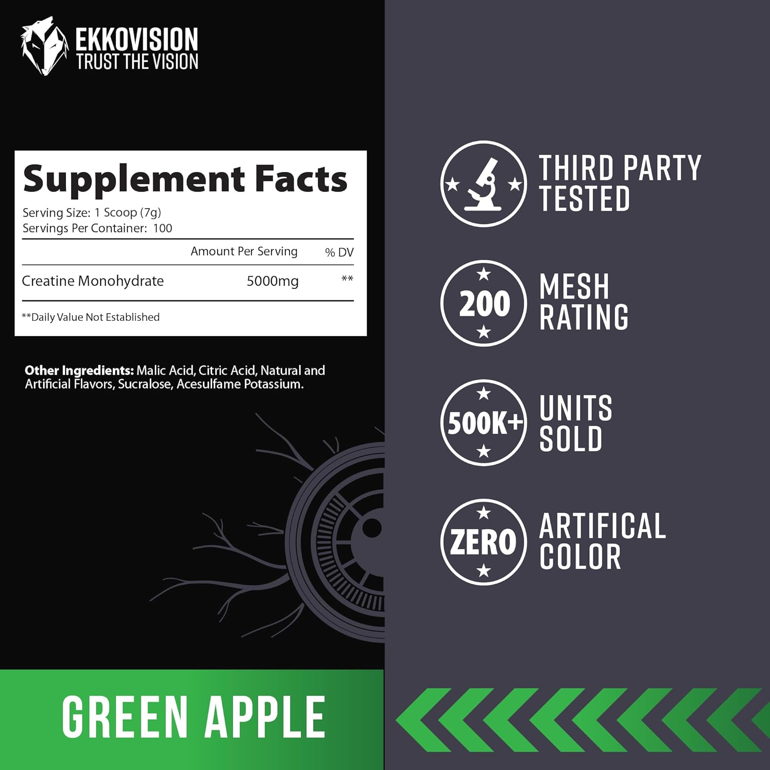 - CRISP AND REFRESHING GREEN APPLE FLAVOR: Ekkovision Creatine Monohydrate in Green Apple flavor delivers a tangy and crisp taste that adds a refreshing twist to your routine. Mix it effortlessly with water, juice, shakes, or smoothies for a smooth, clump-free experience. Perfect for those who enjoy a vibrant, fruity flavor in their supplements.
