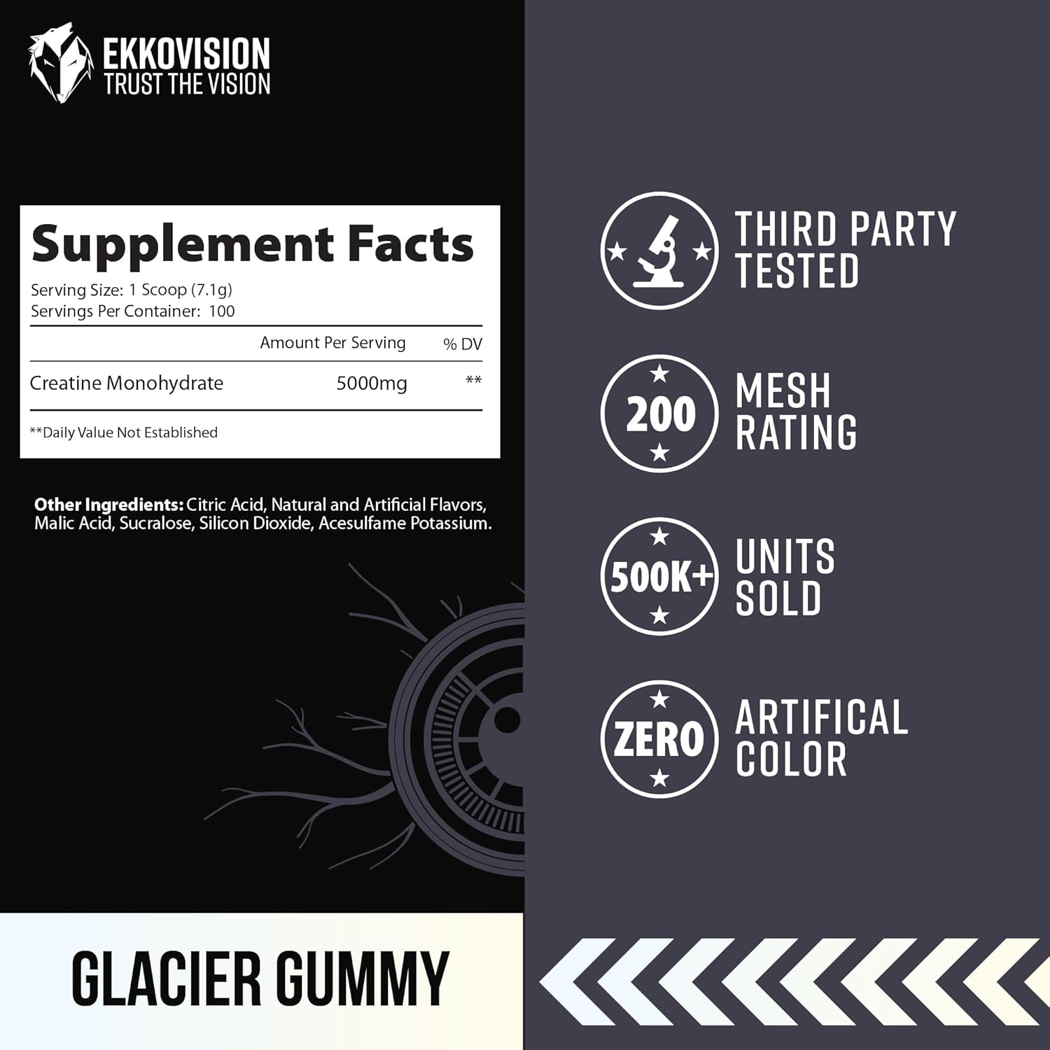 - COOL AND SWEET FOR A FUN SUPPLEMENT EXPERIENCE: Glacier Gummy flavor offers a cool, candy-like sweetness that makes your daily creatine intake exciting and enjoyable. Its micronized texture ensures effortless mixing, creating a smooth, clump-free blend in water, shakes, or smoothies.