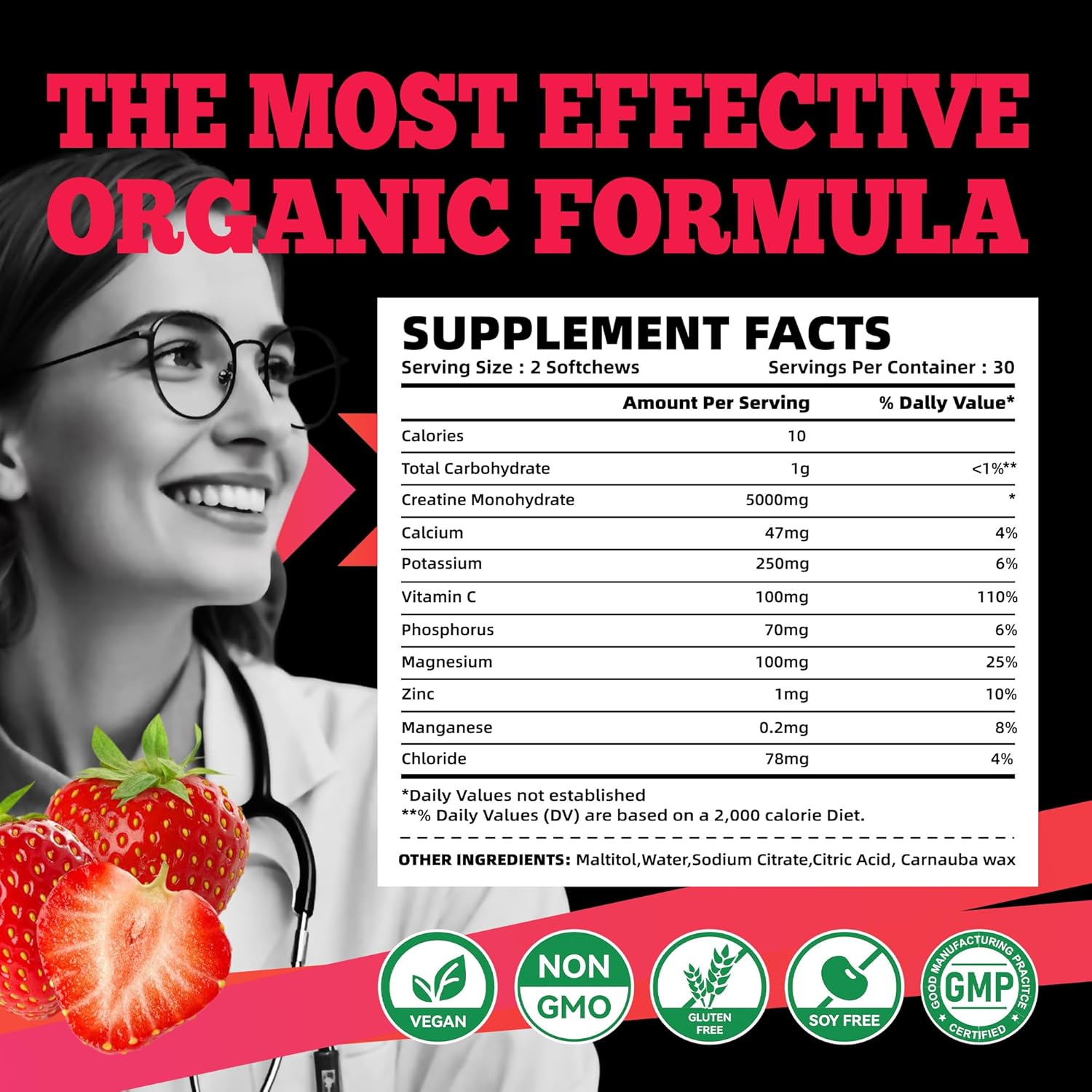 - [Vegan, Gelatin Free, Sugar free]: Each bottle contains 60 count vegan, non-GMO & gluten-free, sugar free creatine monohydrate chews. Super delicious.