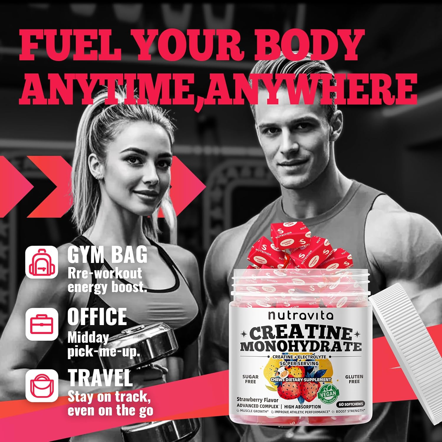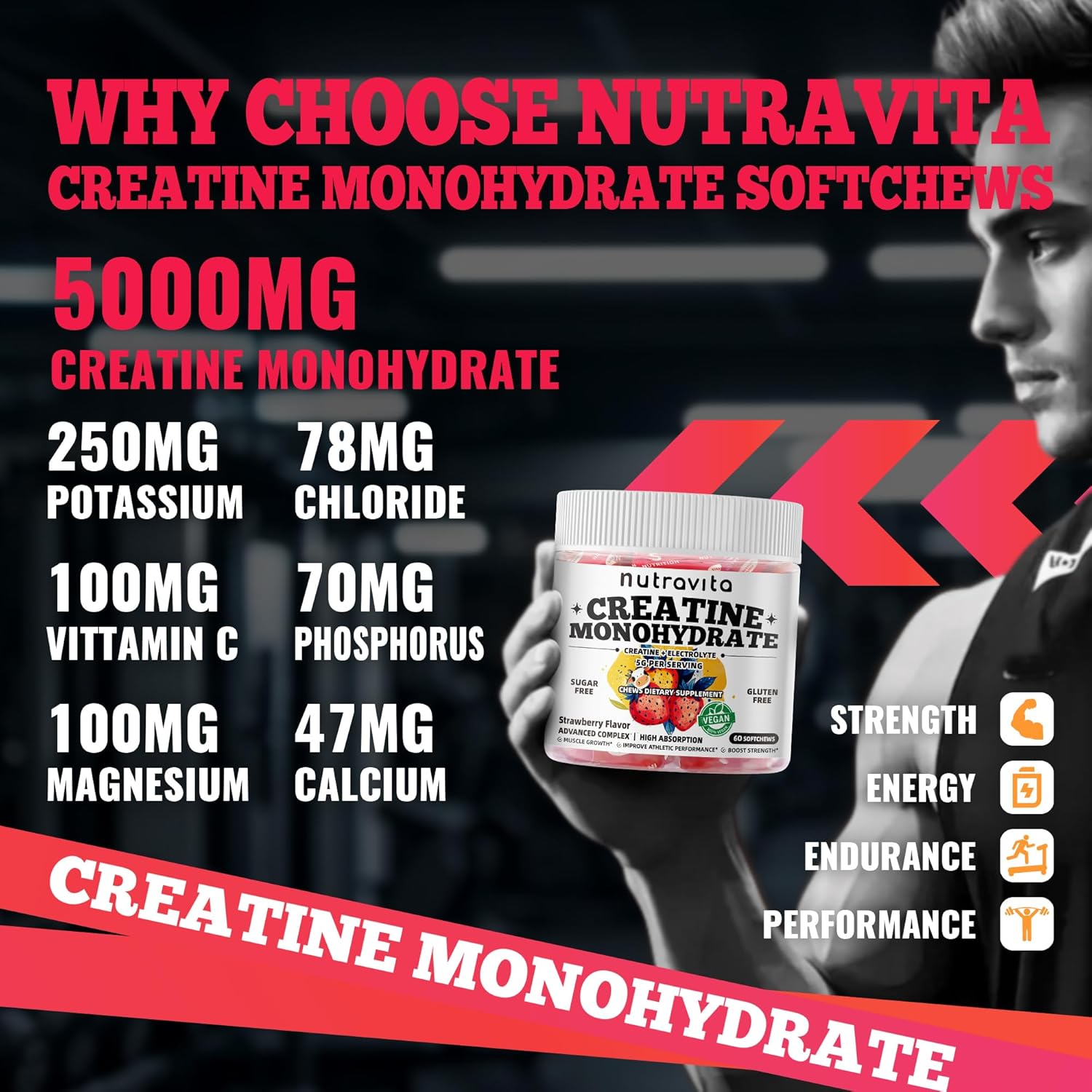 Creatine Monohydrate Chews (5g) – Pre-Workout Energy & Muscle Growth Support for Men & Women | Strawberry Electrolyte Gummies (60 Count)