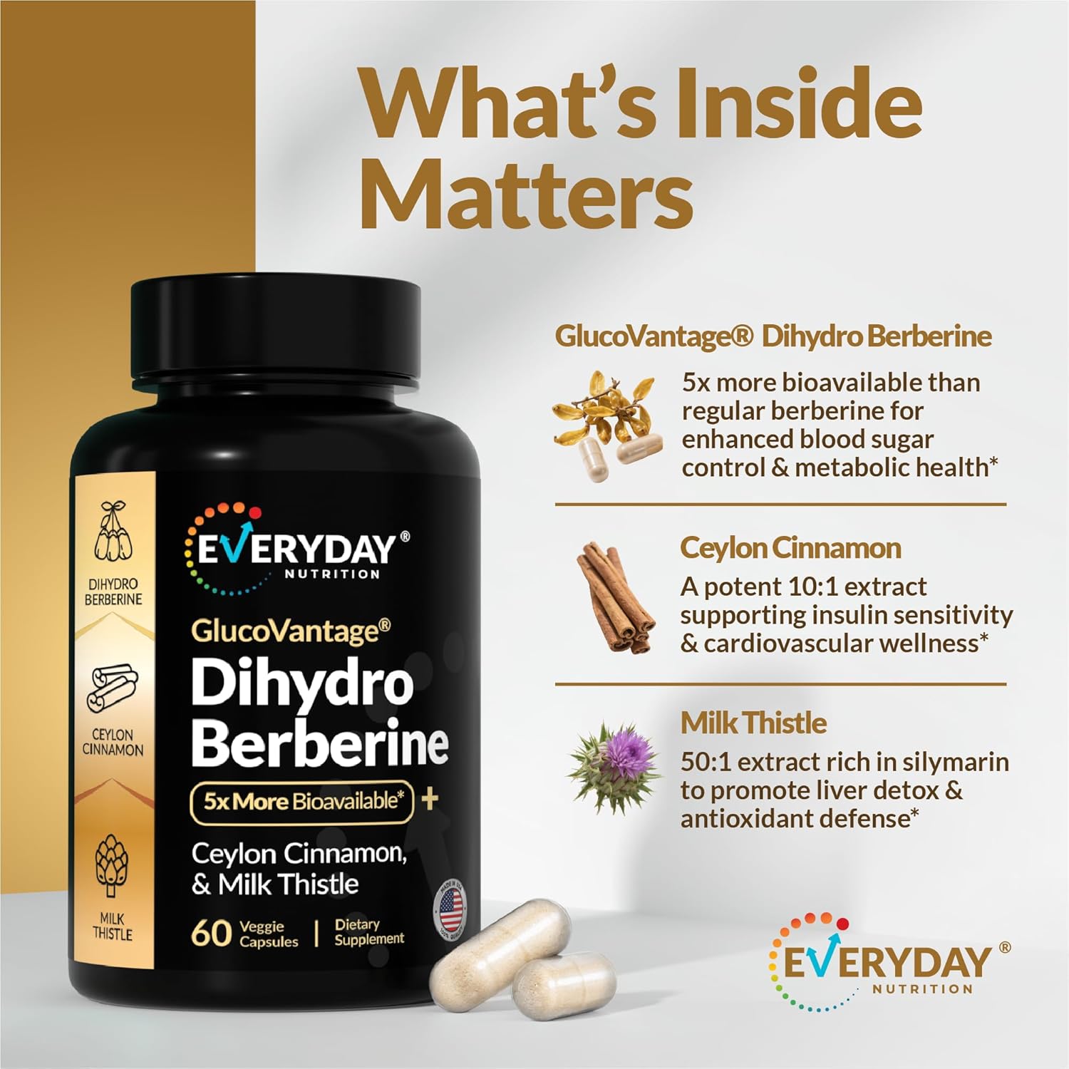 - ONLY THE BEST: EVERYDAY NUTRITION brings you a potent formula featuring GlucoVantage Dihydroberberine, Ceylon Cinnamon, and Milk Thistle. Crafted in the USA under strict GMP standards, this clean supplement ensures purity, effectiveness, and premium quality for your wellness.