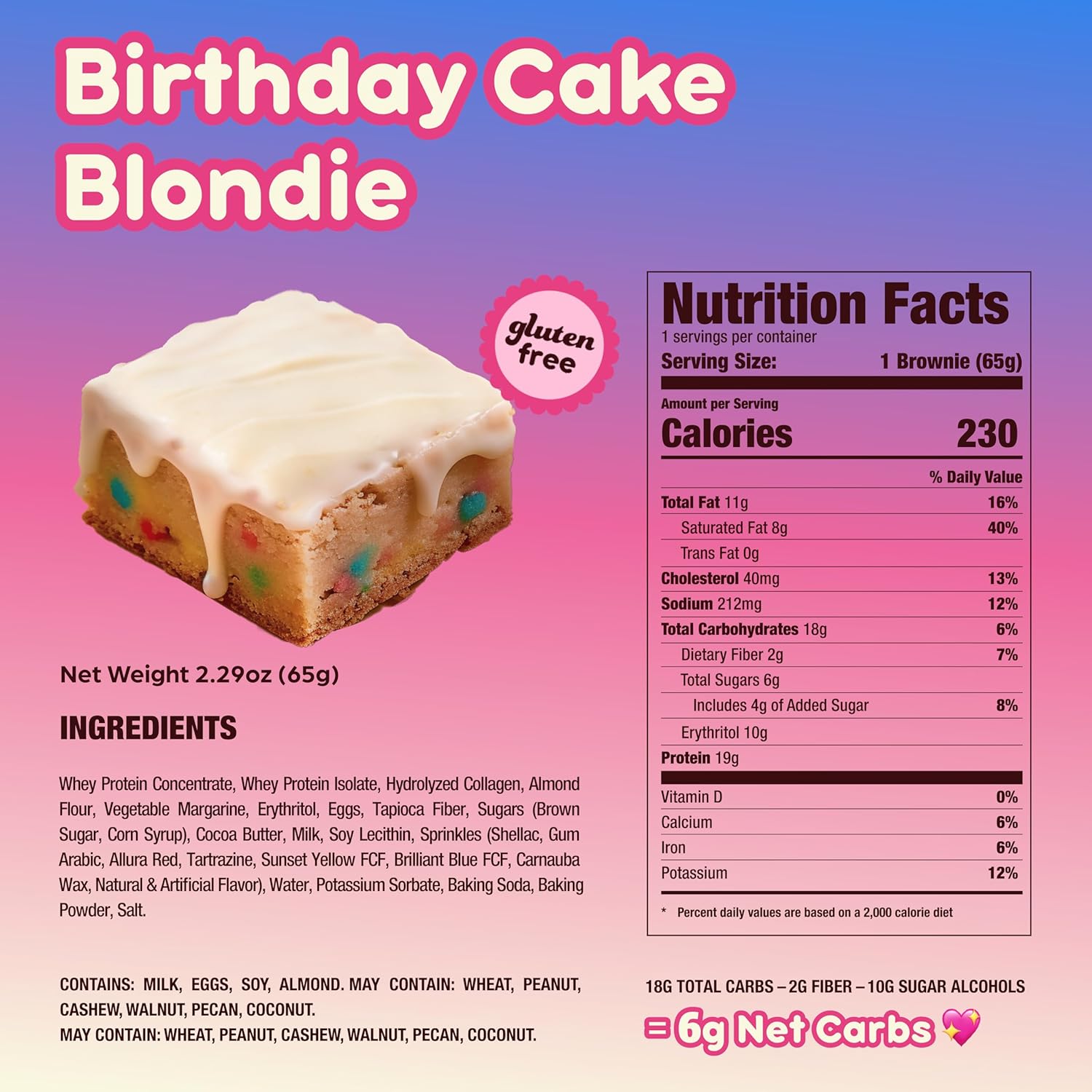 Prime Bites Protein Brownie from Alpha Prime Supplements | High Protein, Collagen Fortified Low Sugar Treat | Delicious Snack | 12 Bars per Box (Birthday Cake Blondie)
