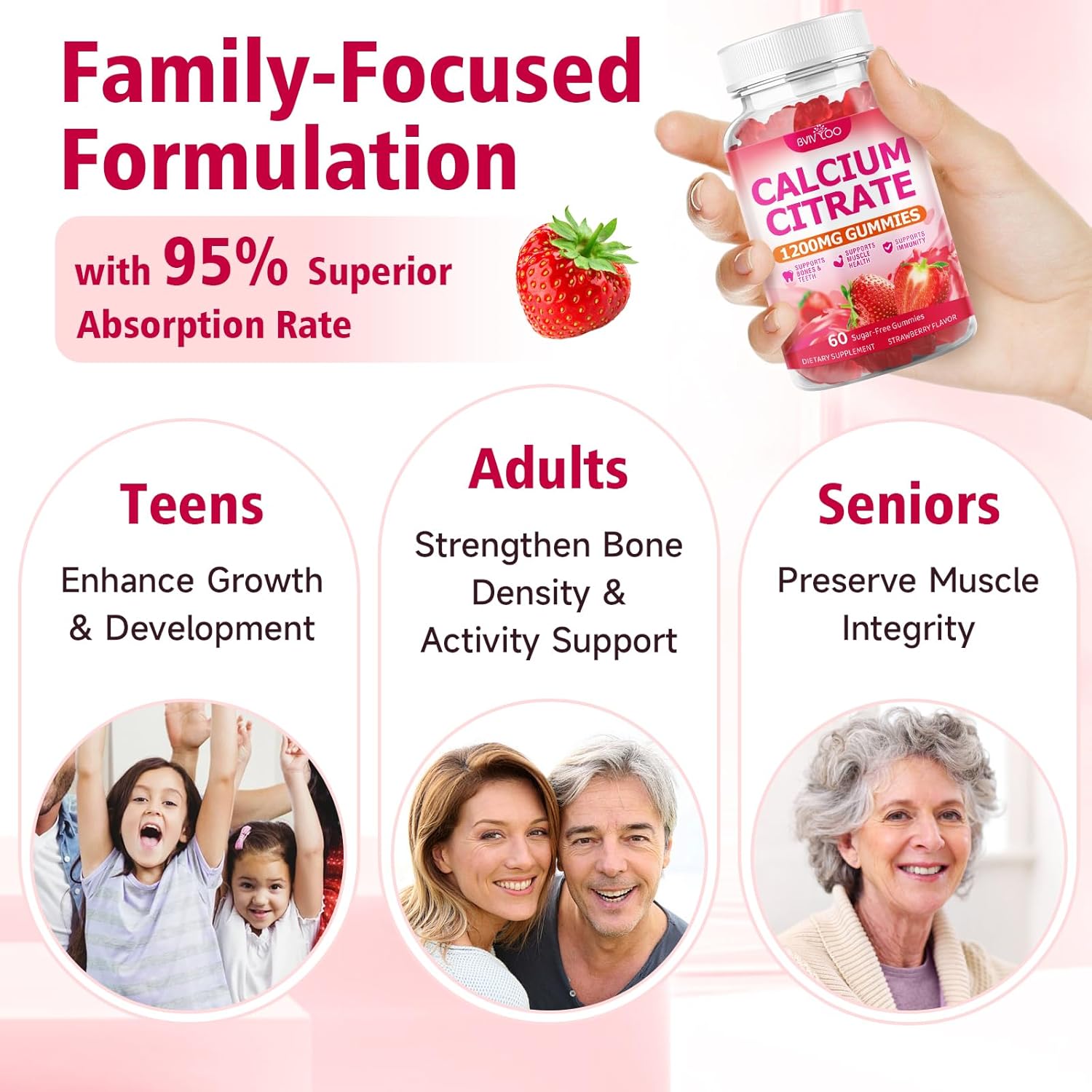 2 Packs High Absorption Calcium Citrate Gummies 1200mg - Bone & Teeth Support for Adults & Kids, Vegan Sugar-Free Gummies, Strawberry Flavor, 120 Count