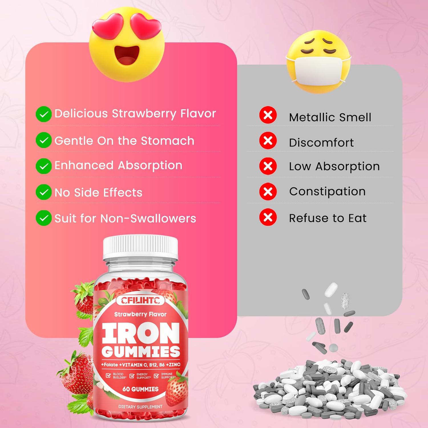 - NOURISH YOUR BLOOD HEALTH: CFILIHTC iron supplements is essential for hemoglobin and red blood cell production. Our gummies, fortified with Folate and B12, promote healthy blood cell formation, prevent anemia, and enhance oxygen transport in the body.