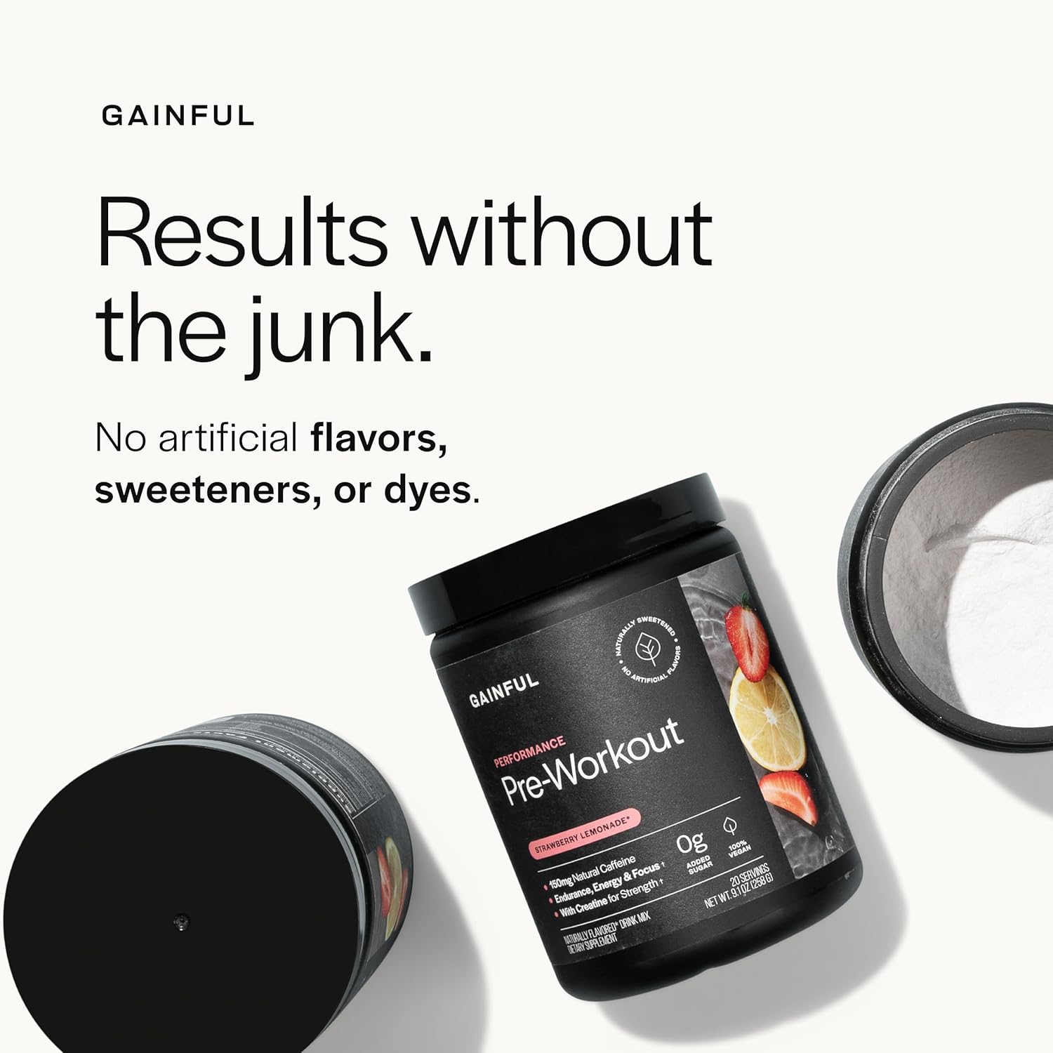 Gainful Performance Pre Workout Powder with Natural Caffeine & Creatine, Strawberry Lemonade Flavor, Supports Energy, Strength, Endurance, & Recovery, BCAAs, Beta Alanine, L-Citrulline, 20 Servings