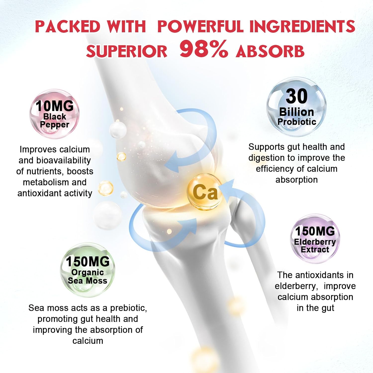 - Strengthen bones, teeth, and muscles: Calcium is essential for maintaining strong and healthy bones. Vitamin D3 ensures your body effectively absorbs calcium, directing it to your bones and teeth, while Vitamin K2 works synergistically with D3 to guide calcium to the right places—preventing buildup in arteries and soft tissues. Vitamin C boosts immunity and acts as an antioxidant, and we added Organic Sea Moss and Elder rich in natural vitamin minerals, Studies show seamoss calcium absorption up to 96%.
