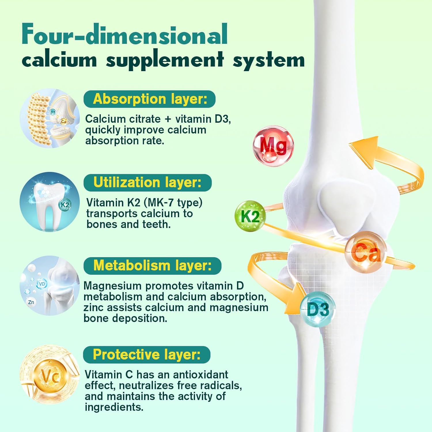 - CALCIUM CITRATE EXTREMELY ABSORBED: Our 1200mg calcium citrate gummies are rich in vitamins D3, K2, C, magnesium and zinc, which work synergistically to enhance the body's absorption and utilization of calcium, providing optimal support for healthy bones and teeth, while providing strong immune support. Compared with traditional calcium carbonate, calcium citrate gummies do not rely on stomach acid, are burden-free to take on an empty stomach, and have a high absorption rate.