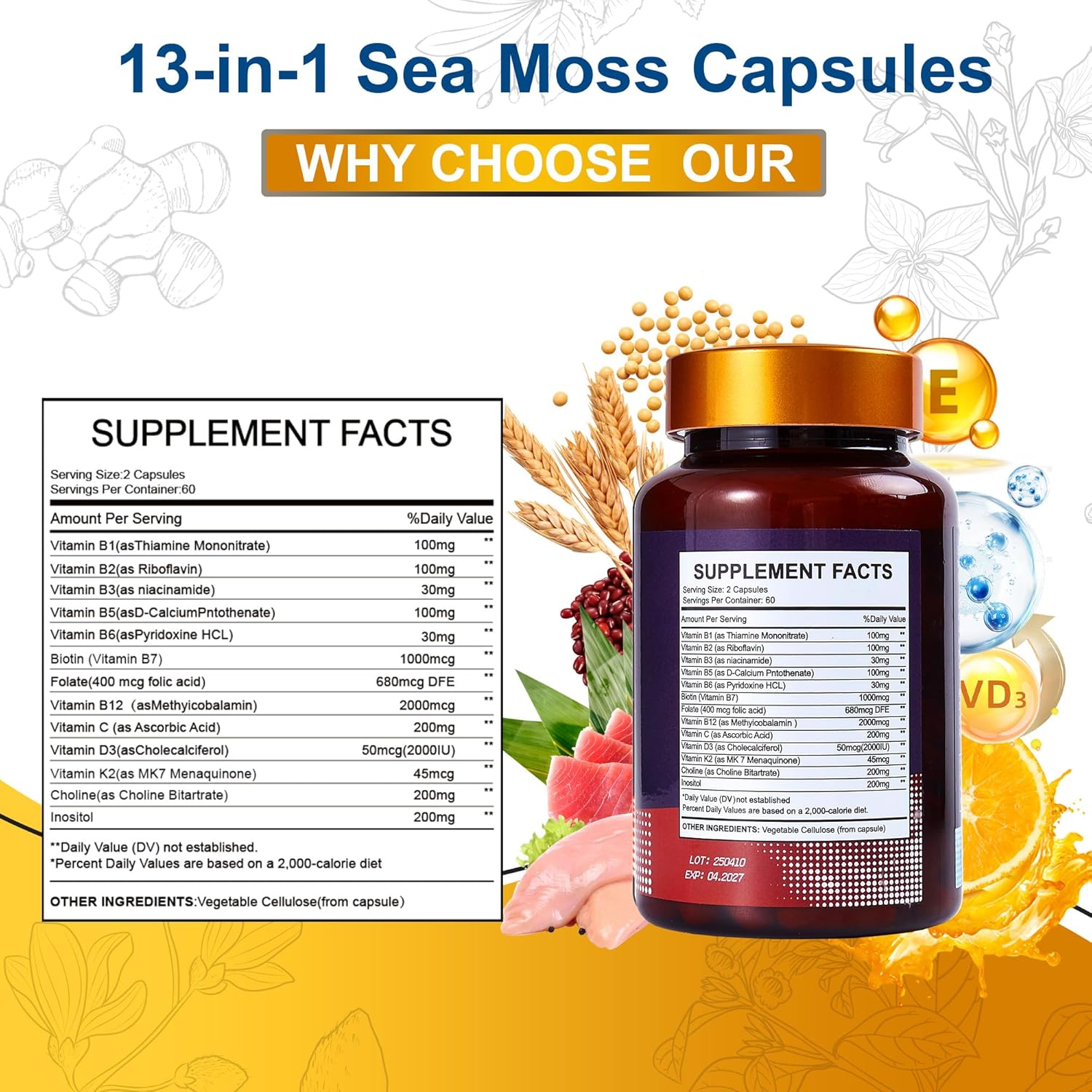- Vccvaa’s advanced B complex supplement includes B1, B2 (Riboflavin), B3 (Niacinamide), B4 (Choline), B5, B6, B7 (Biotin), B8 (Inositol), B9 (Folate), B12, plus added Vitamin C, D3 & K2. This high-potency blend provides daily support for energy metabolism, nerve function, immune resilience, and skin radiance.