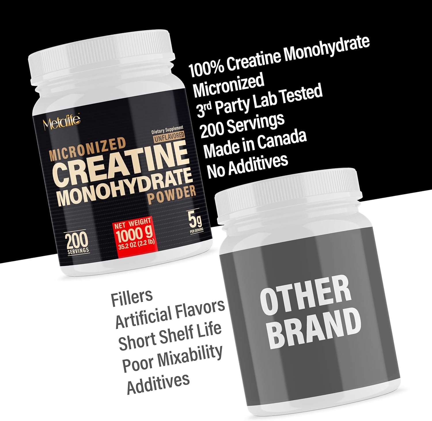 100% Pure Creatine Monohydrate Powder, Canada-Made, 1000 g (200 Servings) Micronized Powder, Muscle Growth, Unflavored, Ideal for Athletes & Fitness Enthusiasts, Third party lab tested, Vegan