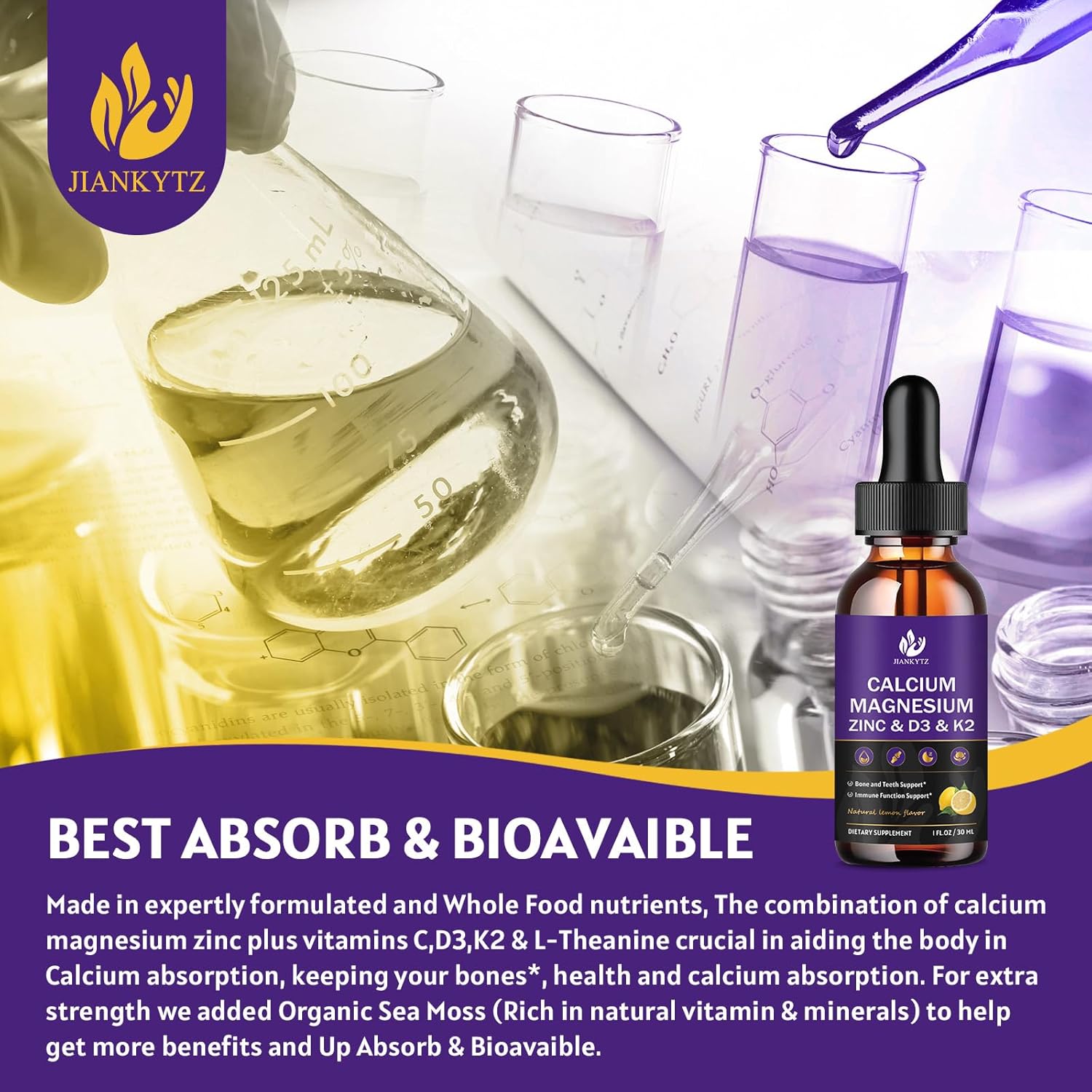 (4 Pack) Calcium Magnesium Zinc Liquid Drops for Women and Men - Bone & Teeth, Immune Support, Liquid Calcium Supplement with Magnesium Glycinate, Vitamin C D3 K2 B6, Lemon Flavor | Sugar Free