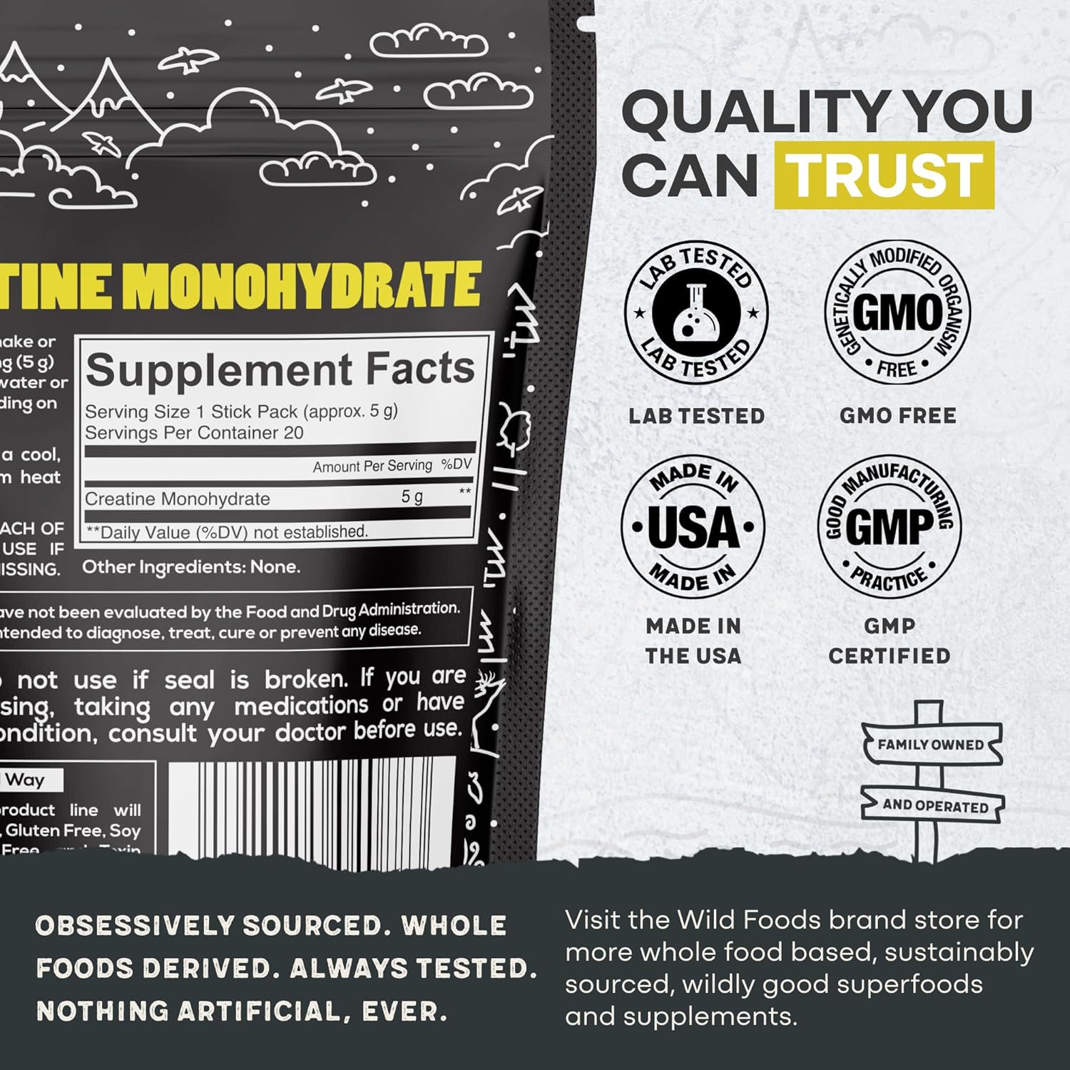 - The Wild Foods Promise: Made in the USA in a GMP-compliant facility, Wild Foods Creatine is rigorously tested for quality and purity. We are committed to providing a clean, effective product to help you achieve your fitness and performance goals.