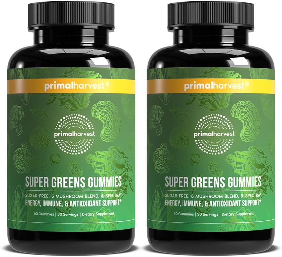 Primal Harvest Super Greens Gummies, Superfood Blend with Adaptogenic Mushrooms Vitamins & Nutrient-Rich Minerals & Antioxidants for Energy & Immune Support (1 Pack (60 Count), Berry)