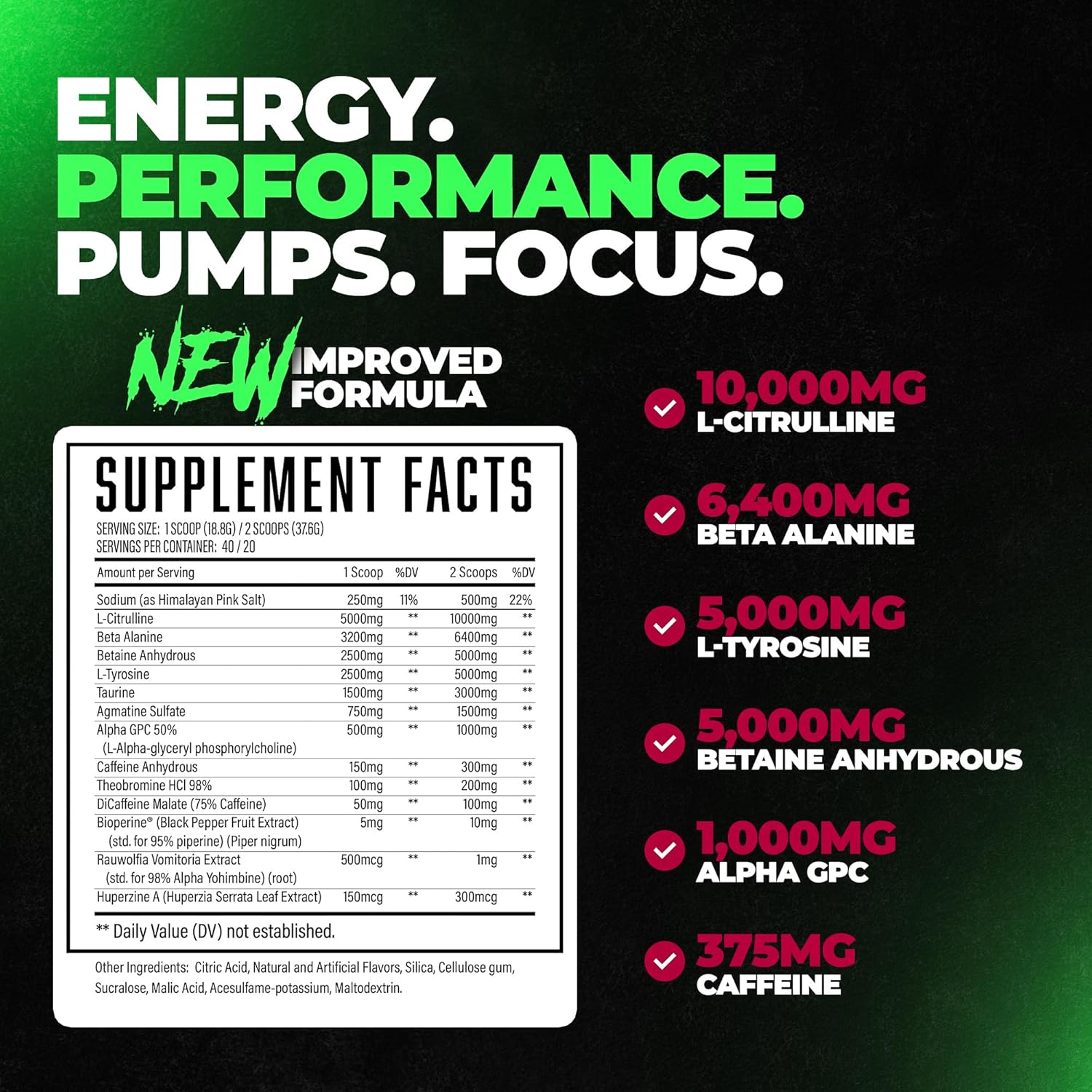 - New & Improved Pre-Workout Formula: Formulated for those who demand more from their pre-workout, our improved Wrecked formula boosts every angle of your performance. It's designed to supercharge energy, focus, pumps, and power to help you push through the most intensive workouts.