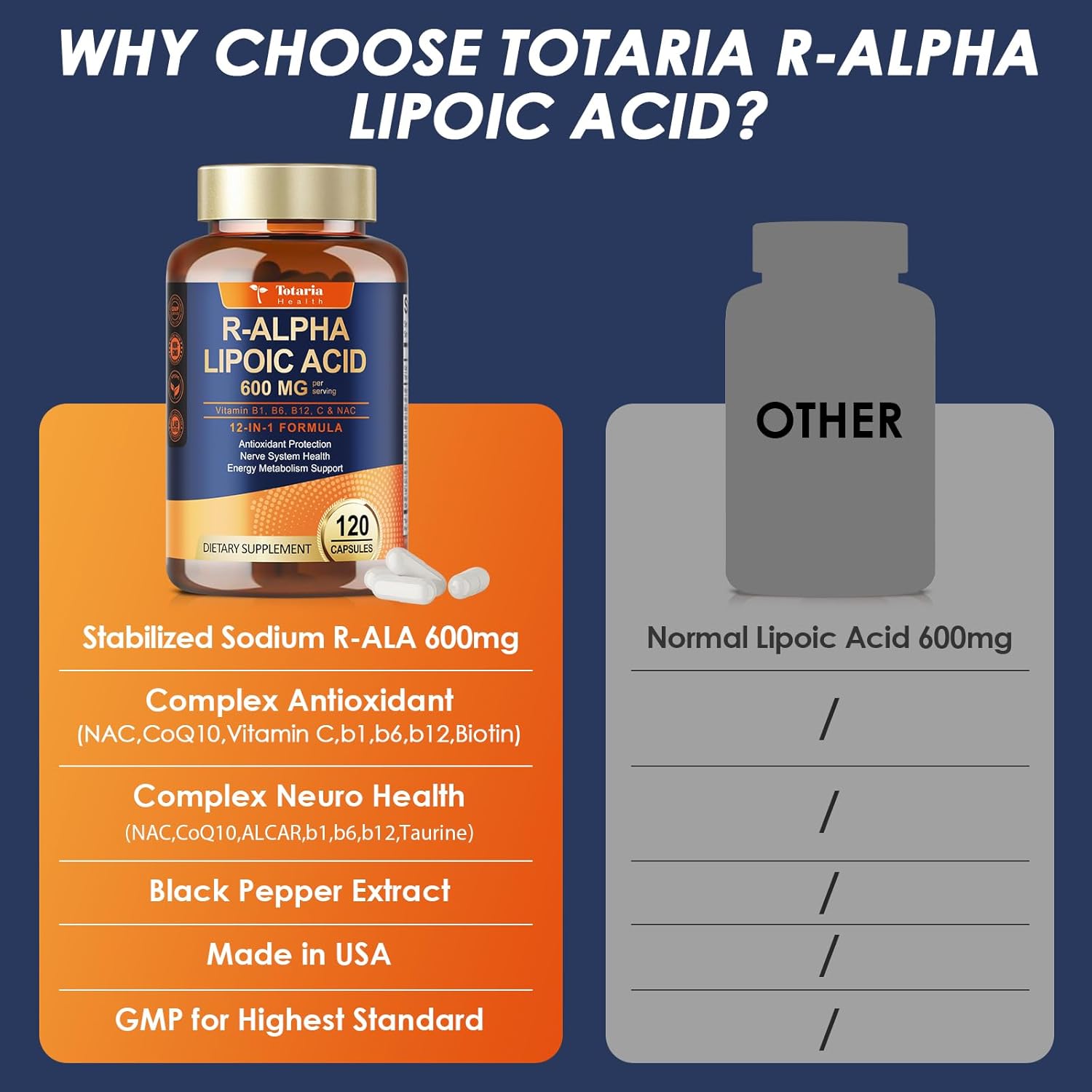 - Comprehensive Cellular & Neuro Protection: Totaria R-Lipoic Acid Capsules are expertly formulated with a synergistic blend of high-potency ingredients—Sodium R-Lipoic Acid, NAC, Acetyl-L-Carnitine, CoQ10, Taurine, Black Pepper Extract, and essential vitamins including B1, B6, B12, Biotin, and Vitamin C—to help defend against oxidative stress and support optimal nervous system health and emotional balance.