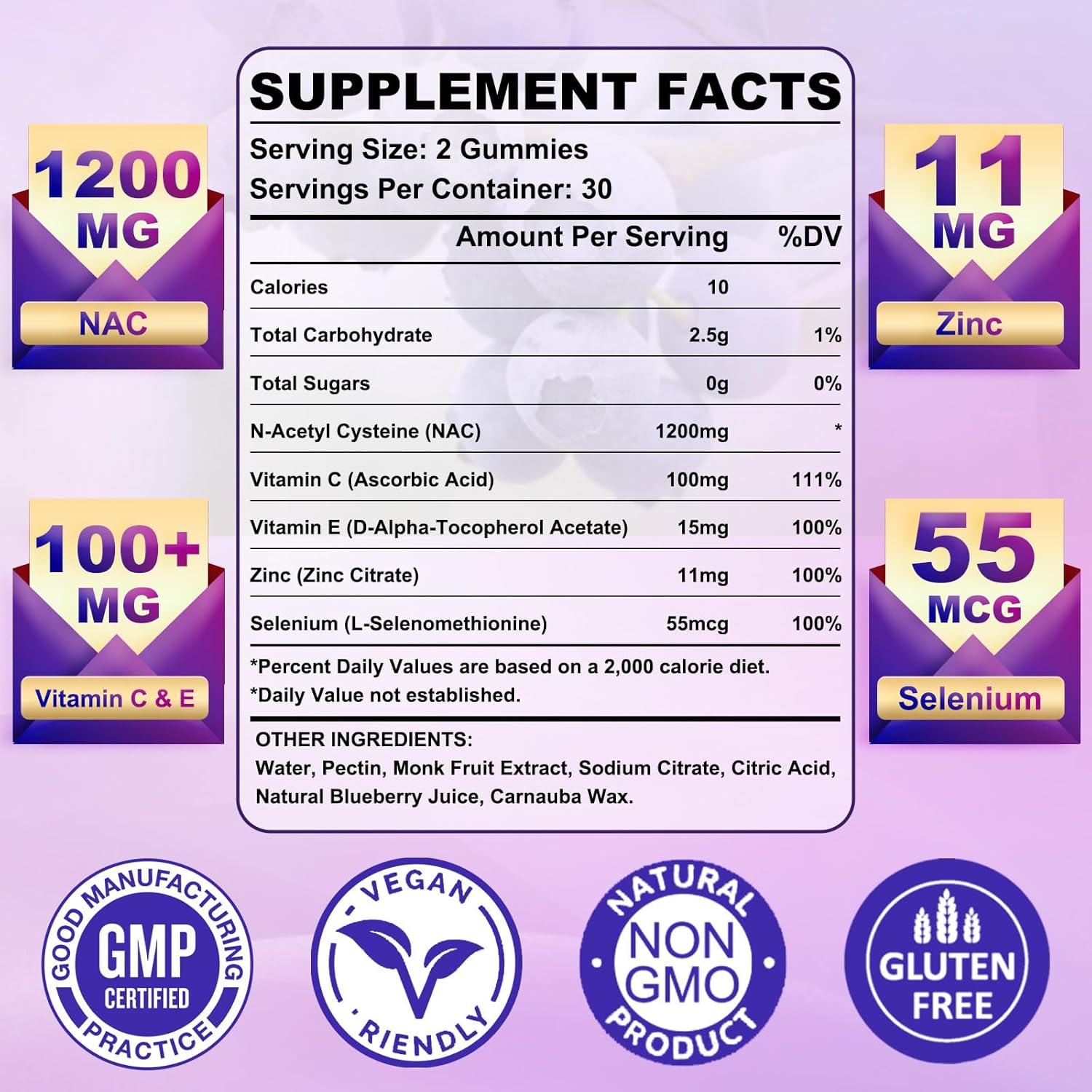 2 Pack N-Acetyl Cysteine Gummies for Kids & Adults, 1200mg N-Acetyl Cysteine Supplement with Selenium Zinc Vitamin C & E for Liver Health, Antioxidant, Immune System, 120 Count, Sugar Free