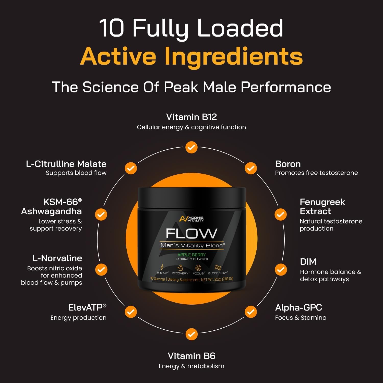 - UNLEASH PURE MASCULINE POWER – Reclaim your edge with Adonis Vitality FLOW, a performance-driven nitric oxide booster for men, supporting blood flow, recovery, energy, stamina, and natural testosterone levels for peak physical and mental performance