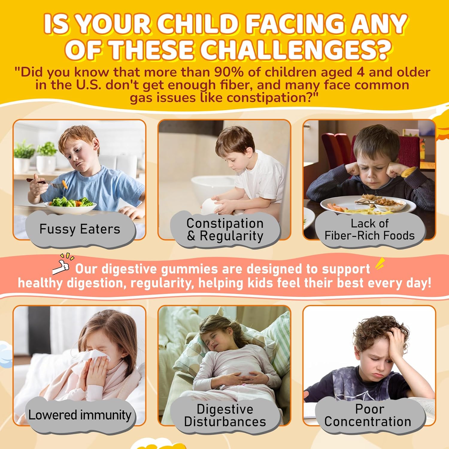 - 🌿 10+1 Superfood Fiber Blend – 5g Daily Gut Fuel: This powerful blend delivers 5g of total dietary fiber from 10 fruits and veggies plus prebiotics inulin to nourish your child’s gut and support healthy digestion.Added plant-based fiber sources to provide natural digestive support and essential nutrients.Inulin from chicory root helps feed good bacteria and maintain gut balance.The easy-to-enjoy gummy supports smoother digestion and regularity—no more mealtime struggles or picky eating battles.