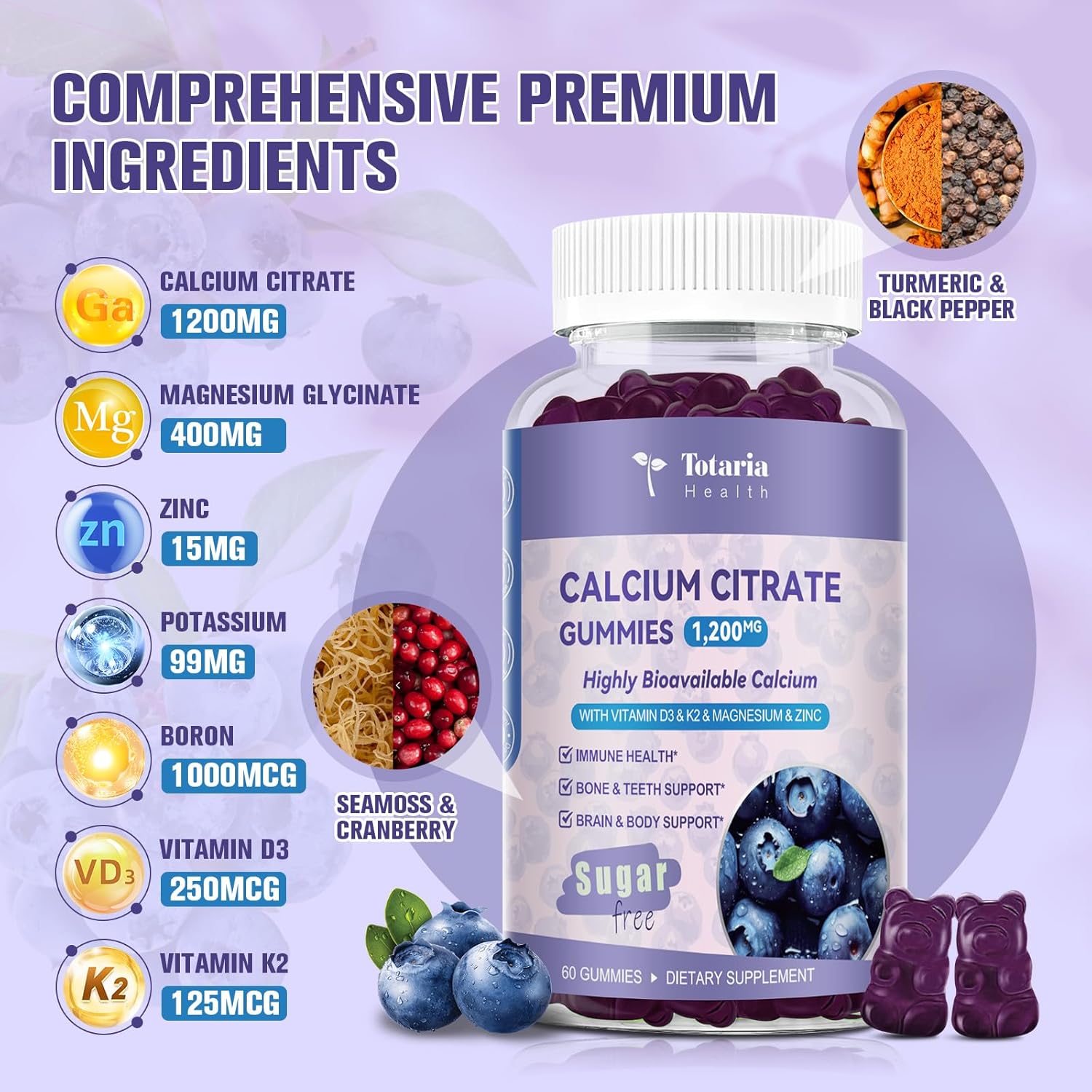 - Comprehensive Premium Ingredients - Our calcium citrate gummies are infused with vitamins d3 and k2, as well as magnesium, zinc, potassium, and boron to supplement your daily needs, and extracts of seaweed, cranberries, turmeric, and black pepper to give you complete health protection.